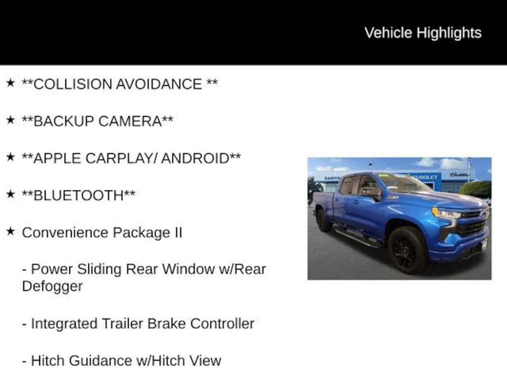 Certified. CARFAX One-Owner. Clean CARFAX. **COLLISION AVOIDANCE **, **BACKUP CAMERA**, **APPLE CARPLAY/ ANDROID**, **BLUETOOTH**, Convenience Package II, Dual Exhaust w/Polished Outlets, Heavy-Duty Air Filter, Hill Descent Control, Hitch Guidance w/Hitch View, Integrated Trailer Brake Controller, Off-Road Suspension, Power Sliding Rear Window w/Rear Defogger, Premium Bose 7-Speaker Sound System, Trailering App, Universal Home Remote, Z71 Off-Road Package. Priced below KBB Fair Purchase Price! Odometer is 17093 miles below market average! 22/26 City/Highway MPGGM Details:* Limited Warranty: 12 Month/12,000 Mile (whichever comes first) from certified purchase date* Powertrain Limited Warranty: 72 Month/100,000 Mile (whichever comes first) from original in-service date* 172 Point Inspection* Roadside Assistance* Vehicle History* 24 months/24,000 miles (whichever comes first) Certified Pre-Owned Scheduled Maintenance Plan and 3 days/150 miles (whichever comes first) Vehicle Exchange Program. SiriusXM 3-month trial subscription.* Transferable Warranty* Warranty Deductible: $0We Buy cars- Fast, Fair and Easy This 2022 Glacier Blue Metallic Chevrolet Silverado 1500 RST 4WD is well equipped and includes these features and benefits: Convenience Package II (Hitch Guidance w/Hitch View, Integrated Trailer Brake Controller, Power Sliding Rear Window w/Rear Defogger, Premium Bose 7-Speaker Sound System, Trailering App, and Universal Home Remote), Z71 Off-Road Package (Dual Exhaust w/Polished Outlets, Heavy-Duty Air Filter, Hill Descent Control, and Off-Road Suspension), Convenience Package (10-Way Power Driver Seat w/Lumbar, 120-Volt Bed Mounted Power Outlet, 120-Volt Instrument Panel Power Outlet, Dual Rear USB Ports (Charge Only), Dual-Zone Automatic Climate Control, Electric Rear-Window Defogger, Heated Driver & Front Outboard Passenger Seats, Heated Steering Wheel, Keyless Open & Start, Leather Wrapped Steering Wheel, Manual Tilt/Telescoping Steering Column, Remote Vehicle Starter System, and Theft Deterrent System (Unauthorized Entry)), Dark Essentials Package (LPO) (Black Name Plates (LPO)), High Capacity Suspension Package, Leather Package (Leather-Appointed Front Seat Trim), Preferred Equipment Group 1SP (12.3 Multicolor Reconfigurable Digital Display, 6-Speaker Audio System, All-Star Edition, Auto-Locking Rear Differential, Bluetooth® For Phone, Chevrolet Connected Access Capable, Color-Keyed Carpeting Floor Covering, Compass, Deep-Tinted Glass, Electrical Steering Column Lock, Electronic Cruise Control, EZ Lift Power Lock & Release Tailgate, Front Frame-Mounted Black Recovery Hooks, Front LED Fog Lamps, Front Rubberized Vinyl Floor Mats, HD Rear Vision Camera, Heated Power-Adjustable Outside Mirrors, High Gloss Black Mirror Caps, Inside Rear-View Mirror w/Tilt, LED Cargo Area Lighting, OnStar & Chevrolet Connected Services Capable, Power Front Windows w/Driver Express Up/Down, Power Front Windows w/Passenger Express Down, Power Rear Windows w/Express Down, Rear 60/40 Folding Bench Seat (Folds Up), Rear Rubberized-Vinyl Floor Mats, SiriusXM w/360L, Standard Tailgate, Steering Wheel Audio Controls, Wi-Fi Hot Spot Capable, and Wireless Phone Projection), Protection Package (Chevytec Spray-On Black Bedliner and Rear Wheelhouse Liners), Standard Suspension Package, Trailering Package (Hitch Guidance), Up-Level Rear Seat w/Storage Package, Z71 Off-Road & Protection Package (All-Weather Floor Liner (LPO) (AAK)), 2 USB Data Ports, 220 Amp Alternator, 3.23 Rear Axle Ratio, 4-Wheel Disc Brakes, 40/20/40 Front Split-Bench Seat, 6 Speakers, ABS brakes, Air Conditioning, Alloy wheels, AM/FM radio: SiriusXM with 360L, Apple CarPlay/Android Auto, Auto High-beam Headlights, Automatic Emergency Braking, Automatic temperature control, Brake assist, Bumpers: body-color, Cloth Seat Trim, Delay-off headlights, Driver door bin, Driver vanity mirror, Dual front impact airbags, D
