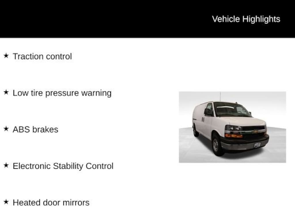 We Buy cars- Fast, Fair and Easy This 2025 Summit White Chevrolet Express 3500 Extended Work Van RWD is well equipped and includes these features and benefits: ABS brakes, Electronic Stability Control, Heated door mirrors, Low tire pressure warning, Traction control, 16 x 6.5 Steel Wheels, 2 Speakers, 3.42 Rear Axle Ratio, 4-Wheel Disc Brakes, Air Conditioning, AM/FM radio, AM/FM Stereo w/MP3 Player, Delay-off headlights, Driver & Front Passenger High-Back Bucket Seats, Driver door bin, Driver's Seat Mounted Armrest, Dual front impact airbags, Dual front side impact airbags, Exterior Parking Camera Rear, Front anti-roll bar, Front Bucket Seats, Front Reclining High-Back Bucket Seats, Front wheel independent suspension, Full-Length Black Rubberized-Vinyl Floor Covering, Fully automatic headlights, Occupant sensing airbag, Overhead airbag, Passenger cancellable airbag, Passenger door bin, Passenger seat mounted armrest, Power door mirrors, Power steering, Power windows, Single-Zone Manual Air Conditioning, Tachometer, Trip computer, Variably intermittent wipers, Vinyl Seat Trim, and Voltmeter.