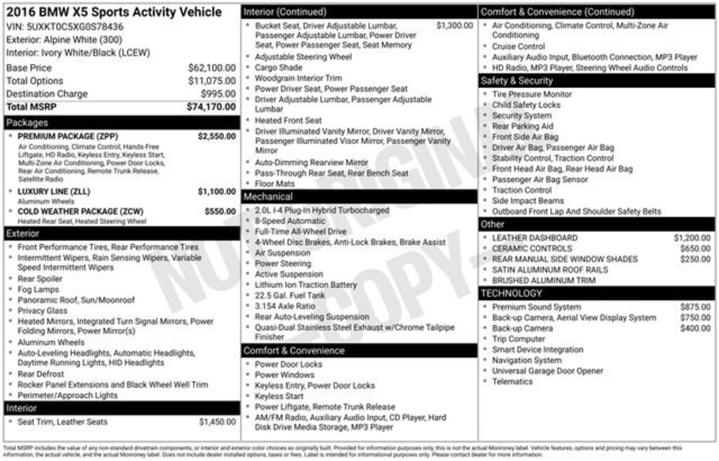 We Buy cars- Fast, Fair and Easy This 2016 Alpine White BMW X5 xDrive40e AWD is well equipped and includes these features and benefits: 10 Speakers, 3.154 Axle Ratio, 4-Wheel Disc Brakes, 4-Zone Automatic Climate Control, ABS brakes, Adaptive suspension, Air Conditioning, Alloy wheels, AM/FM radio, Anti-Theft AM/FM Stereo w/CD/MP3, Anti-whiplash front head restraints, Auto tilt-away steering wheel, Auto-dimming door mirrors, Auto-dimming Rear-View mirror, Auto-leveling suspension, Automatic temperature control, Brake assist, Brushed Aluminum Trim, Bumpers: body-color, CD player, Ceramic Controls, Comfort Access Keyless Entry, Delay-off headlights, Driver door bin, Driver vanity mirror, Dual front impact airbags, Dual front side impact airbags, Electronic Stability Control, Emergency communication system: BMW Assist eCall, Enhanced USB & Bluetooth, Four wheel independent suspension, Front anti-roll bar, Front Bucket Seats, Front Center Armrest, Front dual zone A/C, Front fog lights, Front reading lights, Fully automatic headlights, Garage door transmitter, Genuine wood console insert, Genuine wood dashboard insert, Genuine wood door panel insert, harman/kardon Surround Sound System, Head restraints memory, Heated door mirrors, Heated Front Seats, Heated front seats, Heated Rear Seats, Heated Steering Wheel, Hi-Fi Sound System, High intensity discharge headlights: Bi-xenon, Illuminated entry, Leather Dashboard, Low tire pressure warning, Lumbar Support, Luxury Line (3E1), Memory seat, Multi-Contour Seats, Navigation System, Occupant sensing airbag, Outside temperature display, Overhead airbag, Overhead console, Panic alarm, Passenger door bin, Passenger vanity mirror, Poplar Wood Trim, Power adjustable front head restraints, Power door mirrors, Power driver seat, Power Front Seats, Power moonroof, Power passenger seat, Power steering, Power windows, Radio data system, Rain sensing wipers, Rear anti-roll bar, Rear Manual Side Window Shades, Rear reading lights, Rear seat center armrest, Rear window defroster, Rear window wiper, Rear-View Camera, Remote keyless entry, Retractable Headlight Washers, Roof rack: rails only, Satellite Radio w/1 Year Subscription, Satin Aluminum Roof Rails, Security system, SensaTec Upholstery, Speed control, Speed-sensing steering, Speed-Sensitive Wipers, Split folding rear seat, Spoiler, Sport steering wheel, Steering wheel memory, Steering wheel mounted A/C controls, Steering wheel mounted audio controls, Surround View, Tachometer, Telescoping steering wheel, Tilt steering wheel, Traction control, Trip computer, Turn signal indicator mirrors, Variably intermittent wipers, Weather band radio, Wheels: 19 x 9 Multi-Spoke Lt Alloy (Style 448), and Wheels: 19 x 9 V-Spoke Light Alloy (Style 450)