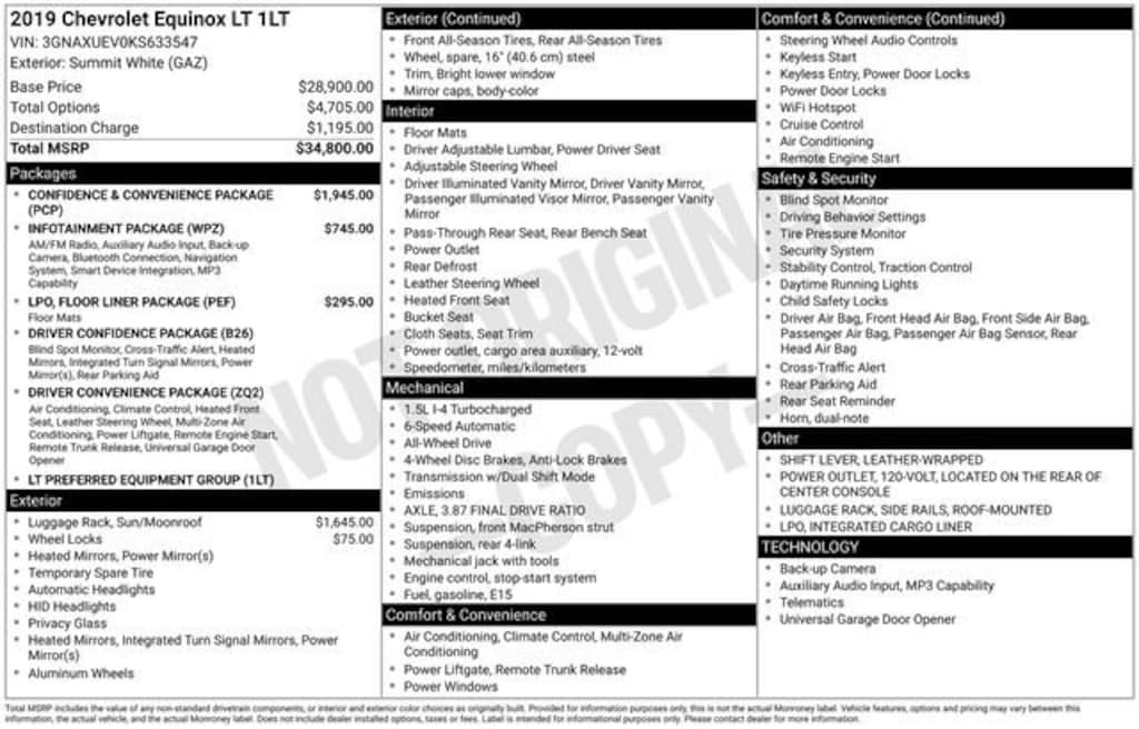We Buy cars- Fast, Fair and Easy This 2019 Summit White Chevrolet Equinox LT AWD is well equipped and includes these features and benefits: Confidence & Convenience Package, Driver Confidence Package (Lane Change Alert w/Side Blind Zone Alert, Outside Heated Power-Adjustable Mirrors, Rear Cross Traffic Alert, and Rear Park Assist w/Audible Warning), Driver Convenience Package (3-Spoke Leather-Wrapped Steering Wheel, Dual Zone Automatic Climate Control, Heated Driver & Front Passenger Seats, Leather-Wrapped Shift Lever, Rear Power Liftgate, Remote Vehicle Starter System, and Universal Home Remote), Floor Liner Package (LPO) (All-Weather Floor Liners (LPO) and Integrated Cargo Liner (LPO)), Infotainment Package (120-Volt Power Outlet, 2 USB Data Ports, 2 USB Data Ports w/SD Card Reader, HD Rear Vision Camera, and Radio: Chevrolet Infotainment 3 Plus System w/Navi), Preferred Equipment Group 1LT, 17 Aluminum Wheels, 2 Rear USB Charging-Only Ports, 2 USB Ports & Auxiliary Input Jack, 2-Way Power Driver Lumbar Control Seat Adjuster, 3.87 Final Drive Axle Ratio, 4-Wheel Disc Brakes, 6 Speaker Audio System Feature, 6 Speakers, 8-Way Power Driver Seat Adjuster, ABS brakes, Air Conditioning, Alloy wheels, AM/FM radio: SiriusXM, Apple CarPlay/Android Auto, Bluetooth® For Phone, Brake assist, Bumpers: body-color, Compass, Delay-off headlights, Driver door bin, Driver vanity mirror, Dual front impact airbags, Dual front side impact airbags, Electronic Stability Control, Emergency communication system: OnStar and Chevrolet connected services capable, Four wheel independent suspension, Front anti-roll bar, Front Bucket Seats, Front Center Armrest, Front Passenger 4-Way Manual Seat Adjuster, Front reading lights, Fully automatic headlights, Heated door mirrors, High-Intensity Discharge Headlights, Illuminated entry, Low tire pressure warning, Occupant sensing airbag, Outside temperature display, Overhead airbag, Overhead console, Panic alarm, Passenger door bin, Passenger vanity mirror, Power door mirrors, Power driver seat, Power steering, Power Sunroof, Power windows, Premium audio system: Chevrolet MyLink, Premium Cloth Seat Trim, Radio data system, Radio: Chevrolet Infotainment 3 System w/AM/FM, Rear anti-roll bar, Rear reading lights, Rear seat center armrest, Rear window defroster, Rear window wiper, Remote keyless entry, Roof-Mounted Luggage Rack Side Rails, Security system, Set of 4 Wheel Locks (LPO), SiriusXM Radio, Speed control, Speed-sensing steering, Split folding rear seat, Spoiler, Steering wheel mounted audio controls, Tachometer, Telescoping steering wheel, Tilt steering wheel, Traction control, Trip computer, and Variably intermittent wipers.