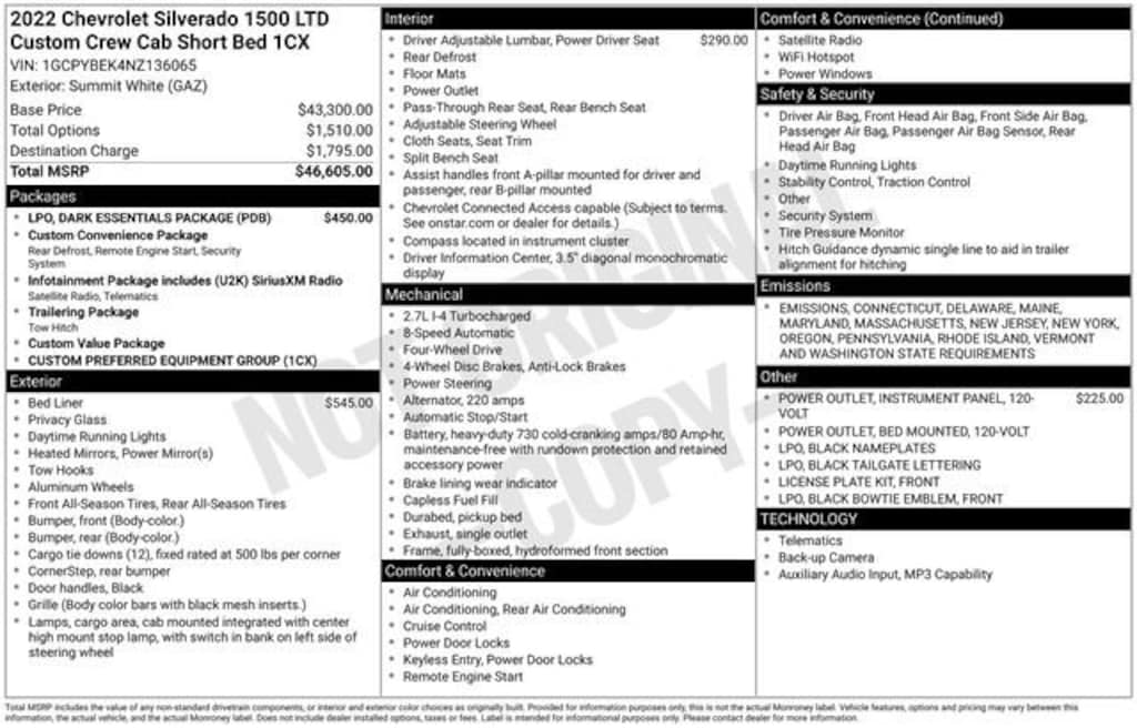 No Payments for 120 days on any New 2025 vehicle only at Capitol Auto Group- with finance terms up to 84 months!! Or any 2023 model or older pre-owned vehicle only at Capitol Auto Group- with finance terms up to 84 months!! Must be a MAPS credit union member to qualify. With an Experian score of 696 or higher. Effective 12-4-2025 through 1-15-2026 See dealer for more qualifying details. CARFAX One-Owner. Clean CARFAX. Priced below KBB Fair Purchase Price! Odometer is 4346 miles below market average!We Buy cars- Fast, Fair and Easy This 2022 Summit White Chevrolet Silverado 1500 LTD Custom 4WD is well equipped and includes these features and benefits: Custom Convenience Package (Electric Rear-Window Defogger, EZ Lift Power Lock & Release Tailgate, LED Cargo Area Lighting, Remote Vehicle Starter System, and Theft Deterrent System (Unauthorized Entry)), Custom Value Package, Infotainment Package (Chevrolet Connected Access Capable, OnStar & Chevrolet Connected Services Capable, SiriusXM Radio, and Wi-Fi Hot Spot Capable), Trailering Package (Hitch Guidance), 3.42 Rear Axle Ratio, 3.5 Monochromatic Display Driver Info Center, 4-Wheel Disc Brakes, 40/20/40 Front Split Bench Seat, 6 Speakers, 6-Speaker Audio System, ABS brakes, Air Conditioning, Alloy wheels, AM/FM radio: SiriusXM, Apple CarPlay/Android Auto, Bluetooth® For Phone, Body Color Grille, Brake assist, Bumpers: body-color, Cloth Seat Trim, Color-Keyed Carpeting Floor Covering, Compass, Deep-Tinted Glass, Delay-off headlights, Driver door bin, Driver vanity mirror, Dual front impact airbags, Dual front side impact airbags, Electronic Cruise Control, Electronic Stability Control, Front anti-roll bar, Front Center Armrest w/Storage, Front Frame-Mounted Black Recovery Hooks, Front reading lights, Front Rubberized Vinyl Floor Mats, Front wheel independent suspension, Fully automatic headlights, Heated door mirrors, Heavy Duty Suspension, Illuminated entry, Low tire pressure warning, Manual Tilt Wheel Steering Column, Occupant sensing airbag, Outside temperature display, Overhead airbag, Overhead console, Panic alarm, Passenger door bin, Passenger vanity mirror, Power Door Locks, Power door mirrors, Power Front Windows w/Driver Express Up/Down, Power Front Windows w/Passenger Express Down, Power Rear Windows w/Express Down, Power steering, Power windows, Premium audio system: Chevrolet Infotainment 3, Radio data system, Radio: Chevrolet Infotainment 3 System, Rear 60/40 Folding Bench Seat (Folds Up), Rear reading lights, Rear Rubberized-Vinyl Floor Mats, Rear step bumper, Rear window defroster, Remote Keyless Entry, Remote keyless entry, Security system, Speed control, Speed-sensing steering, Split folding rear seat, Standard Tailgate, Tachometer, Tilt steering wheel, Traction control, Trip computer, Variably intermittent wipers, Voltmeter, and Wheels: 20 x 9 Bright Silver Painted Aluminum.