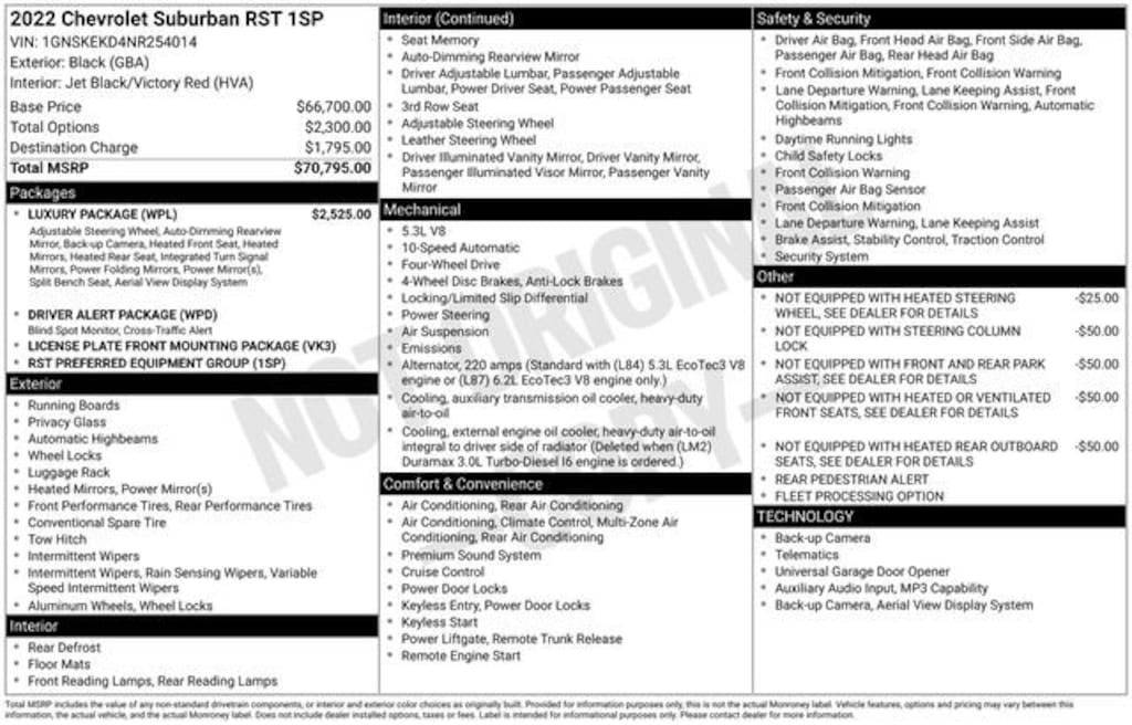 Commanding presence, uncompromised capability, and refined luxury - the 2022 Chevrolet Suburban RST is the ultimate full-size SUV. This exceptional vehicle delivers a driving experience that seamlessly blends power, technology, and comfort, making it the perfect choice for those who demand the very best.Elevating your journey, the Suburban RST offers an impressive array of premium features:- LUXURY PACKAGE: Includes Driver Alert Package, HD Surround Vision, Rear Pedestrian Alert, memory settings, heated and power-folding mirrors, power tilt and telescopic steering column, heated steering wheel, heated second-row seats, and power-folding third-row seats.- Remote Start- Auto High-beam Headlights- Apple CarPlay/Android Auto- HD Surround Vision- Heated front seats- Rain sensing wipersPowered by the robust EcoTec3 5.3L V8 engine and paired with a smooth-shifting 10-speed automatic transmission, this Suburban delivers exceptional performance and efficiency, with an EPA-estimated 19 MPG on the highway. Its commanding 4WD capability ensures you can conquer any terrain with confidence.Step inside and be enveloped in the Suburban's spacious, meticulously crafted cabin. Luxurious perforated leather seating, heated and power-adjustable front seats, and a Bose premium audio system create an unparalleled sensory experience. The Chevrolet Infotainment 3 Premium system with built-in navigation and wireless charging keep you connected and charged on the go.Safety is paramount in the Suburban RST, with features like Forward Collision Alert, Automatic Emergency Braking, Lane Keep Assist with Lane Departure Warning, and Rear Pedestrian Alert providing added peace of mind. The HD Surround Vision camera system offers a 360-degree view, making parking and maneuvering a breeze.Whether you're embarking on a family adventure, towing a boat, or simply commanding the road with style, the 2022 Chevrolet Suburban RST is the ultimate expression of power, technology, and refinement. Experience the difference for yourself and schedule a test drive today.