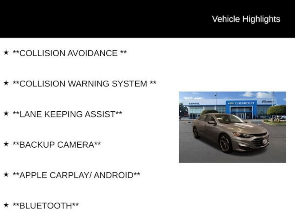 CARFAX One-Owner. Clean CARFAX. **COLLISION AVOIDANCE **, **COLLISION WARNING SYSTEM **, **LANE KEEPING ASSIST**, **BACKUP CAMERA**, **APPLE CARPLAY/ ANDROID**, **BLUETOOTH**. Priced below KBB Fair Purchase Price! Odometer is 2008 miles below market average! 28/36 City/Highway MPGWe Buy cars- Fast, Fair and Easy This 2024 Sterling Gray Metallic Chevrolet Malibu LT FWD is well equipped and includes these features and benefits: Preferred Equipment Group 1LT, 17 Aluminum Wheels, 18 Bright Machined Aluminum Wheels, 4-Wheel Disc Brakes, 6 Speakers, 6-Speaker Audio System Feature, 6-Way Manual Front Passenger Seat Adjuster, 8-Way Power Driver Seat Adjuster, ABS brakes, Air Conditioning, Alloy wheels, AM/FM radio: SiriusXM, Auto High-beam Headlights, Automatic temperature control, Brake assist, Bumpers: body-color, Compass, Delay-off headlights, Deleted 3 Years of Remote Access, Driver door bin, Driver vanity mirror, Dual front impact airbags, Dual front side impact airbags, Electronic Stability Control, Emergency communication system: OnStar and Chevrolet connected services capable, Exterior Parking Camera Rear, Four wheel independent suspension, Front anti-roll bar, Front Bucket Seats, Front Center Armrest, Front dual zone A/C, Front License Plate Bracket, Front reading lights, Fully automatic headlights, Heated door mirrors, Heated Driver & Front Passenger Seats, Heated front seats, Illuminated entry, Knee airbag, Low tire pressure warning, Occupant sensing airbag, Outside temperature display, Overhead airbag, Overhead console, Panic alarm, Passenger door bin, Passenger vanity mirror, Power door mirrors, Power Driver Lumbar Control Seat Adjuster, Power driver seat, Power steering, Power windows, Premium audio system: Chevrolet Infotainment 3 Plus, Premium Cloth Seat Trim, Radio data system, Radio: Chevrolet Infotainment 3 System, Rear anti-roll bar, Rear reading lights, Rear seat center armrest, Rear side impact airbag, Rear window defroster, Remote keyless entry, Road Emergency Tool Kit, Security system, SiriusXM, Speed control, Split folding rear seat, Steering wheel mounted audio controls, Tachometer, Telescoping steering wheel, Tilt steering wheel, Traction control, Trip computer, Variably intermittent wipers, Voltmeter, and Wireless Apple CarPlay/Android Auto.