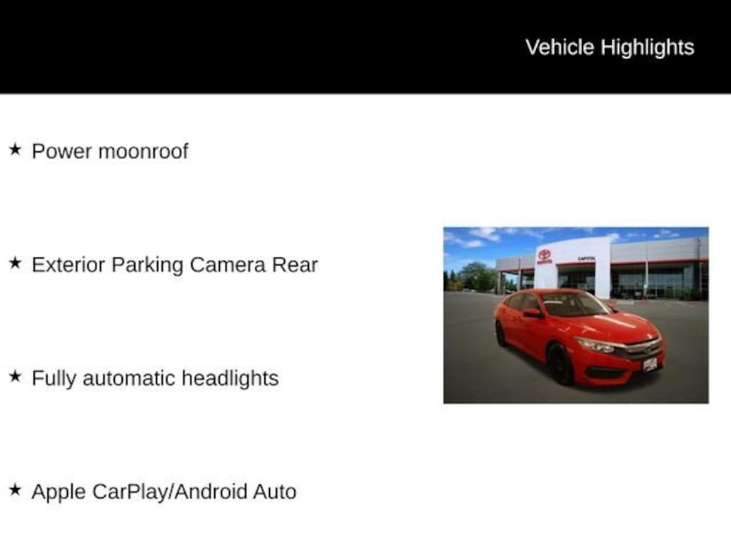 This Civic EX is equipped with a host of premium features that elevate the driving experience. Enjoy the convenience of hands-free connectivity with Apple CarPlay and Android Auto, as well as the added visibility and safety of the rear parking camera. The power moonroof allows you to let in natural light and fresh air, creating an open and airy cabin.