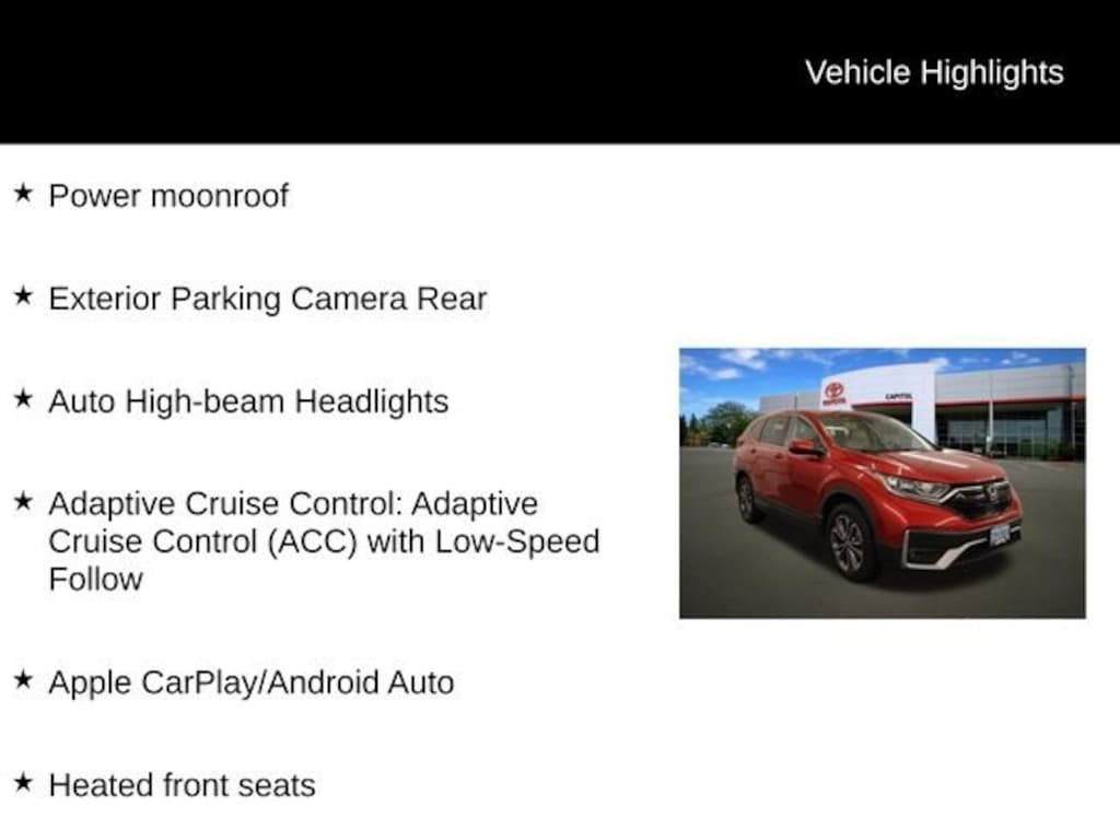 Whether commuting, running errands, or embarking on a road trip, this 2021 Honda CR-V EX is ready to exceed your expectations. Its impressive combination of technology, comfort, and capability make it an outstanding choice in the compact SUV segment.