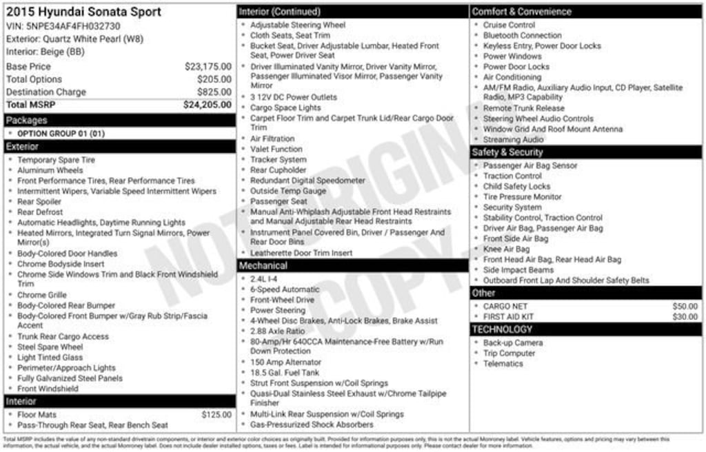 No Payments for 120 days on any New 2025 vehicle only at Capitol Auto Group- with finance terms up to 84 months!! Or any 2023 model or older pre-owned vehicle only at Capitol Auto Group- with finance terms up to 84 months!! Must be a MAPS credit union member to qualify. With an Experian score of 696 or higher. Effective 12-4-2025 through 1-15-2026 See dealer for more qualifying details. Exterior Parking Camera Rear, Fully automatic headlights, Heated front seats, Speed control. Priced below KBB Fair Purchase Price! Odometer is 22909 miles below market average! 24/35 City/Highway MPGAwards:* 2015 KBB.com 15 Best Family Cars * 2015 KBB.com 10 Best Sedans Under $25,000 * 2015 KBB.com Best Buy Awards Finalist * 2015 KBB.com 10 Most Comfortable Cars Under $30,000We Buy cars- Fast, Fair and Easy This 2015 Quartz White Pearl Hyundai Sonata Sport FWD is well equipped and includes these features and benefits: Option Group 01, Exterior Parking Camera Rear, Fully automatic headlights, Heated front seats, Speed control, 4-Wheel Disc Brakes, 6 Speakers, ABS brakes, Air Conditioning, Alloy wheels, AM/FM radio: SiriusXM, Anti-whiplash front head restraints, Brake assist, Bumpers: body-color, Cargo Net, Carpeted Floor Mats, CD player, Delay-off headlights, Driver door bin, Driver vanity mirror, Dual front impact airbags, Dual front side impact airbags, Electronic Stability Control, Emergency communication system: Blue Link, First Aid Kit, Four wheel independent suspension, Front anti-roll bar, Front Bucket Seats, Front Center Armrest, Front reading lights, Heated door mirrors, Heated Front Bucket Seats, Illuminated entry, Knee airbag, Low tire pressure warning, Occupant sensing airbag, Outside temperature display, Overhead airbag, Overhead console, Panic alarm, Passenger door bin, Passenger vanity mirror, Power door mirrors, Power driver seat, Power steering, Power windows, Premium Cloth Seating Surfaces, Radio: AM/FM/SiriusXM/CD/MP3 Audio System, Rear anti-roll bar, Rear reading lights, Rear seat center armrest, Rear window defroster, Remote keyless entry, Security system, Speed-sensing steering, Speed-Sensitive Wipers, Split folding rear seat, Spoiler, Steering wheel mounted audio controls, Tachometer, Telescoping steering wheel, Tilt steering wheel, Traction control, Trip computer, Turn signal indicator mirrors, Variably intermittent wipers, and Wheels: 17 x 7.0J Aluminum Alloy.