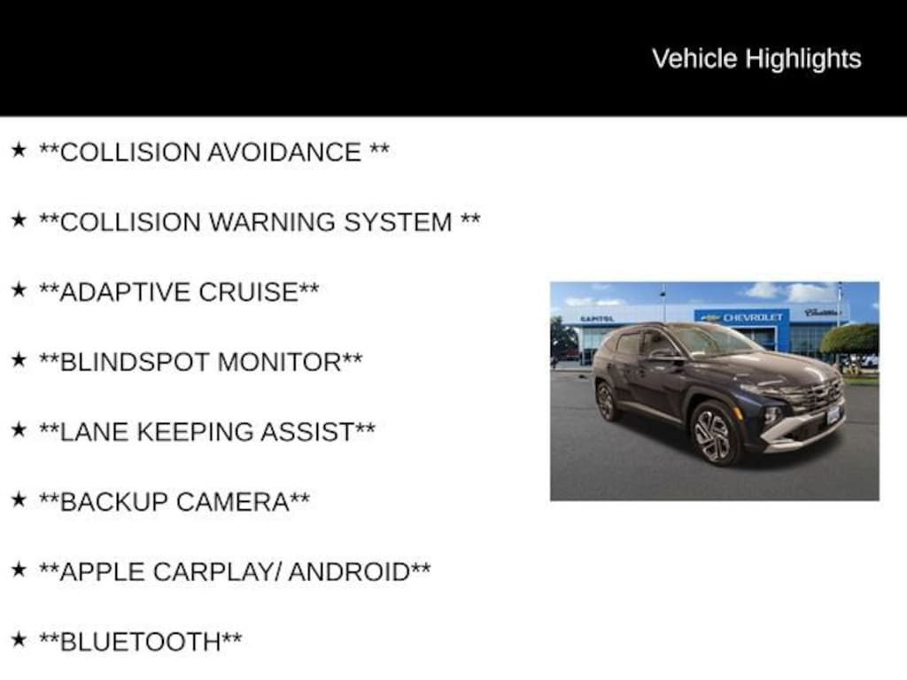 We Buy cars- Fast, Fair and Easy This 2025 Deep Sea Hyundai Tucson Hybrid Limited AWD is well equipped and includes these features and benefits: Option Group 01, 19 Alloy Wheels, 4-Wheel Disc Brakes, 8 Speakers, ABS brakes, Air Conditioning, Alloy wheels, AM/FM radio: SiriusXM, Apple CarPlay & Android Auto, Auto High-beam Headlights, Auto-dimming Rear-View mirror, Automatic temperature control, Brake assist, Bumpers: body-color, Cargo Cover, Cargo Net, Cargo Tray, Carpeted Floor Mats, Delay-off headlights, Driver door bin, Driver vanity mirror, Dual front impact airbags, Dual front side impact airbags, Electronic Stability Control, Emergency communication system: Bluelink+, First Aid Kit, Four wheel independent suspension, Front anti-roll bar, Front Bucket Seats, Front Center Armrest, Front dual zone A/C, Front reading lights, Fully automatic headlights, Garage door transmitter: HomeLink, Heads-Up Display, Heated & Ventilated Front Bucket Seats, Heated door mirrors, Heated front seats, Heated rear seats, Heated steering wheel, Illuminated entry, Leather steering wheel, Leather-Trimmed Seat Trim, Low tire pressure warning, Memory seat, Navigation System, Occupant sensing airbag, Outside temperature display, Overhead airbag, Overhead console, Panic alarm, Passenger door bin, Passenger vanity mirror, Power door mirrors, Power driver seat, Power Liftgate, Power moonroof, Power passenger seat, Power steering, Power windows, Radio data system, Radio: Bose Premium w/AM/FM/HD Audio System, Rain sensing wipers, Rear anti-roll bar, Rear reading lights, Rear seat center armrest, Rear side impact airbag, Rear window defroster, Rear window wiper, Remote keyless entry, Security system, Speed control, Split folding rear seat, Spoiler, Steering wheel mounted audio controls, Tachometer, Telescoping steering wheel, Tilt steering wheel, Traction control, Trip computer, Turn signal indicator mirrors, Variably intermittent wipers, Ventilated front seats, and Wheel Locks.