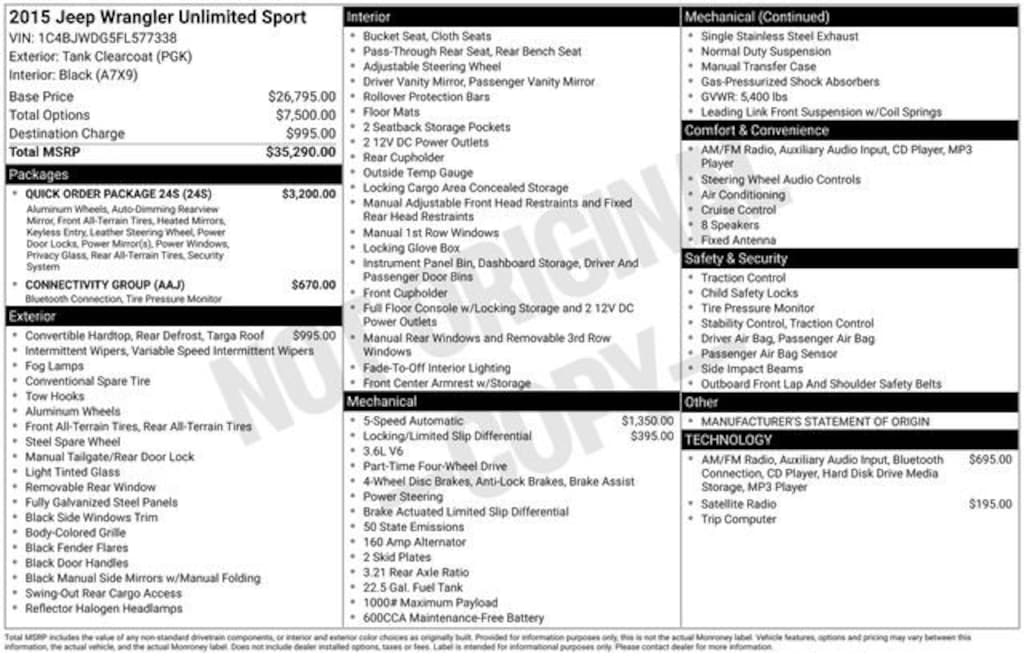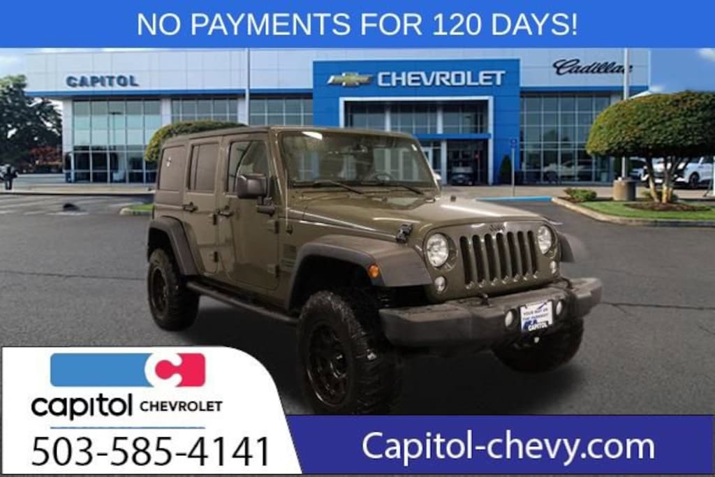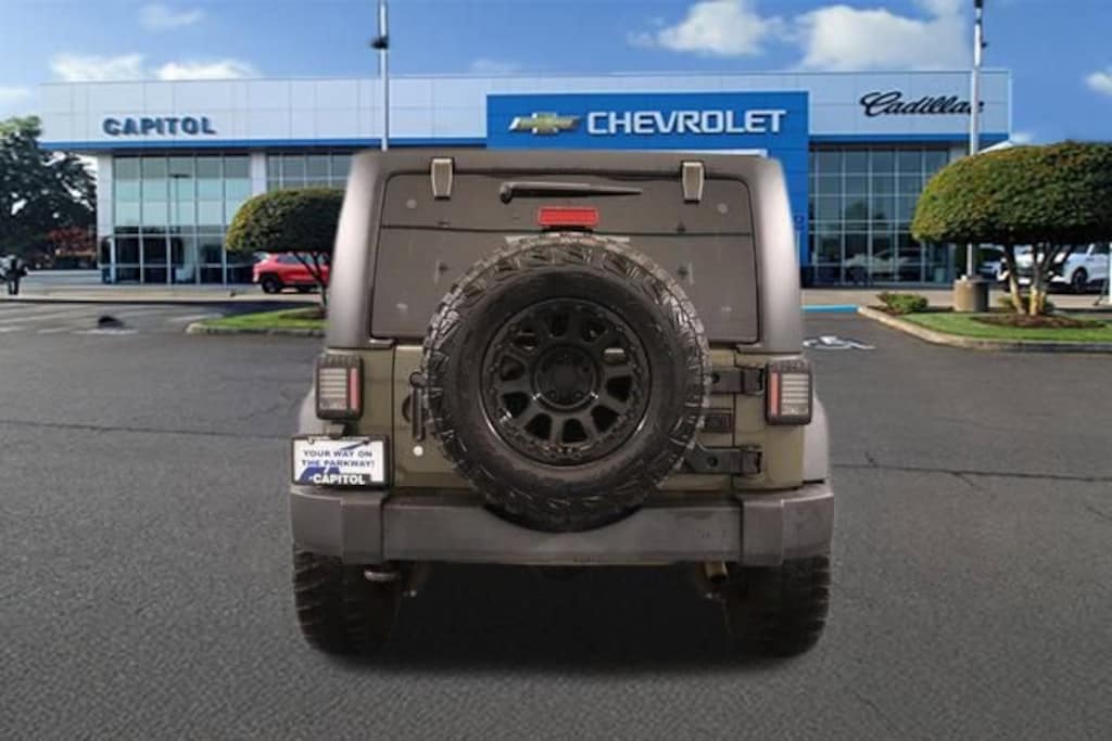No Payments for 120 days on any New 2025 vehicle only at Capitol Auto Group- with finance terms up to 84 months!! Or any 2023 model or older pre-owned vehicle only at Capitol Auto Group- with finance terms up to 84 months!! Must be a MAPS credit union member to qualify. With an Experian score of 696 or higher. Effective 12-4-2025 through 1-15-2026 See dealer for more qualifying details. Clean CARFAX. Priced below KBB Fair Purchase Price! Odometer is 5864 miles below market average!We Buy cars- Fast, Fair and Easy This 2015 Tank Clearcoat Jeep Wrangler Unlimited Sport 4WD is well equipped and includes these features and benefits: Connectivity Group (Tire Pressure Monitoring Display, Uconnect Voice Command w/Bluetooth, and Vehicle Information Center), Quick Order Package 24S (17 x 7.5 Aluminum Wheels, Auto-Dimming Mirror w/Reading Lamp, Chrome/Leather Wrapped Shift Knob, Deep Tint Sunscreen Windows, and Leather Wrapped Steering Wheel), 16 x 7.0 Luxury Styled Steel Wheels, 3.21 Rear Axle Ratio, 4-Wheel Disc Brakes, 8 Speakers, ABS brakes, Air Conditioning, AM/FM radio, Anti-Spin Differential Rear Axle, Black 3-Piece Hard Top, Brake assist, CD player, Cloth Bucket Seats, Compass, Delete Sunrider Soft Top, Driver door bin, Driver vanity mirror, Dual front impact airbags, Electronic Stability Control, Freedom Panel Storage Bag, Front 1-Touch Down Power Windows, Front anti-roll bar, Front Bucket Seats, Front Center Armrest w/Storage, Front fog lights, Integrated roll-over protection, Low tire pressure warning, Manufacturer's Statement of Origin, Normal Duty Suspension, Occupant sensing airbag, Outside temperature display, Passenger door bin, Passenger vanity mirror, Power Heated Mirrors, Power Locks, Power steering, Radio: Uconnect 130 AM/FM/CD/MP3, Radio: Uconnect 430 CD/DVD/MP3/HDD, Rear anti-roll bar, Rear Window Defroster, Rear Window Wiper/Washer, Remote Keyless Entry, Remote USB Port, Security Alarm, SIRIUS Satellite Radio, Speed control, Split folding rear seat, Steering wheel mounted audio controls, Sunrider Soft Top, Tachometer, Tilt steering wheel, Tinted Rear Quarter & Liftgate Windows, Traction control, Trip computer, and Variably intermittent wipers.