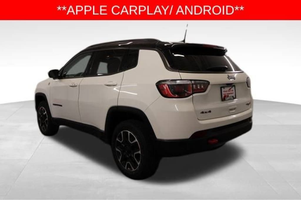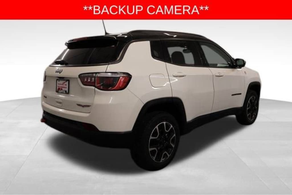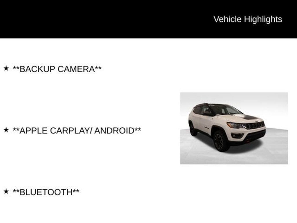 We Buy cars- Fast, Fair and Easy This 2019 White Clearcoat Jeep Compass Trailhawk 4WD is well equipped and includes these features and benefits: Quick Order Package 27E (DISC), 4-Wheel Disc Brakes, 4.334 Axle Ratio, 6 Speakers, ABS brakes, Air Conditioning, Alloy wheels, AM/FM radio: SiriusXM, Anti-whiplash front head restraints, Apple CarPlay/Android Auto, Automatic temperature control, Brake assist, Bumpers: body-color, Compass, Delay-off headlights, Driver door bin, Driver vanity mirror, Dual front impact airbags, Dual front side impact airbags, Electronic Stability Control, Four wheel independent suspension, Front anti-roll bar, Front Bucket Seats, Front Center Armrest w/Storage, Front dual zone A/C, Front fog lights, Front reading lights, Fully automatic headlights, Google Android Auto, GPS Antenna Input, Heated door mirrors, Illuminated entry, Knee airbag, Leather Shift Knob, Low tire pressure warning, Manufacturer's Statement of Origin, Occupant sensing airbag, Outside temperature display, Overhead airbag, Overhead console, Panic alarm, ParkView Rear Back-Up Camera, Passenger door bin, Passenger vanity mirror, Power door mirrors, Power steering, Power windows, Premium Cloth/Leather Trim Bucket Seats, Radio: Uconnect 4 w/8.4 Display, Rear anti-roll bar, Rear seat center armrest, Rear window defroster, Rear window wiper, Remote keyless entry, Roof rack: rails only, Speed control, Split folding rear seat, Spoiler, Steering wheel mounted audio controls, Tachometer, Telescoping steering wheel, Tilt steering wheel, Traction control, Trip computer, Turn signal indicator mirrors, USB Host Flip, Variably intermittent wipers, Wheels: 17 x 6.5 Diamond Cut Aluminum (DISC), and Wheels: 17 x 6.5 Painted/Bright Aluminum.