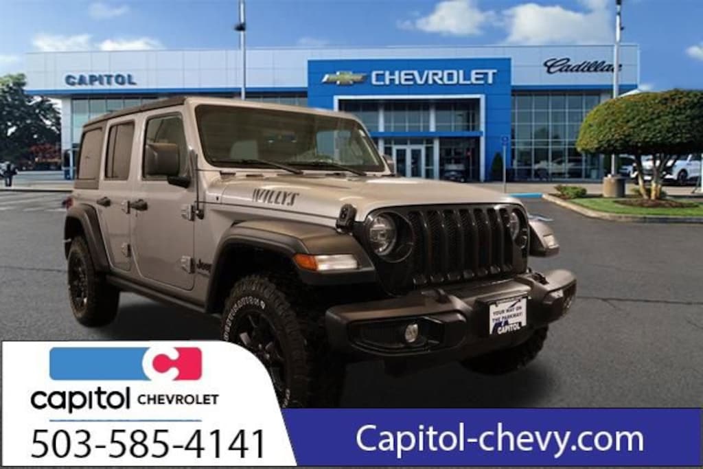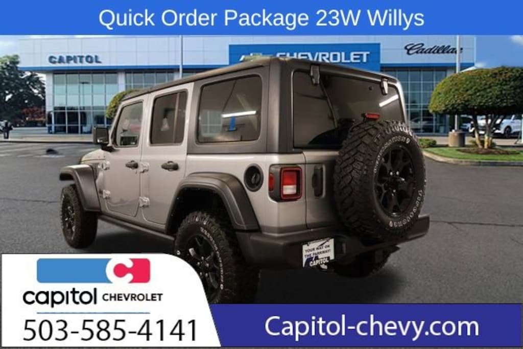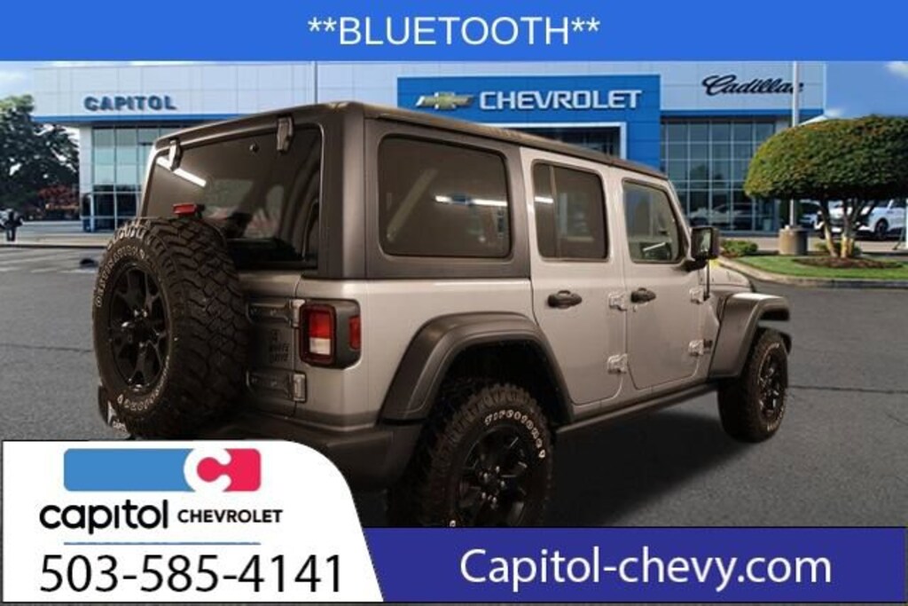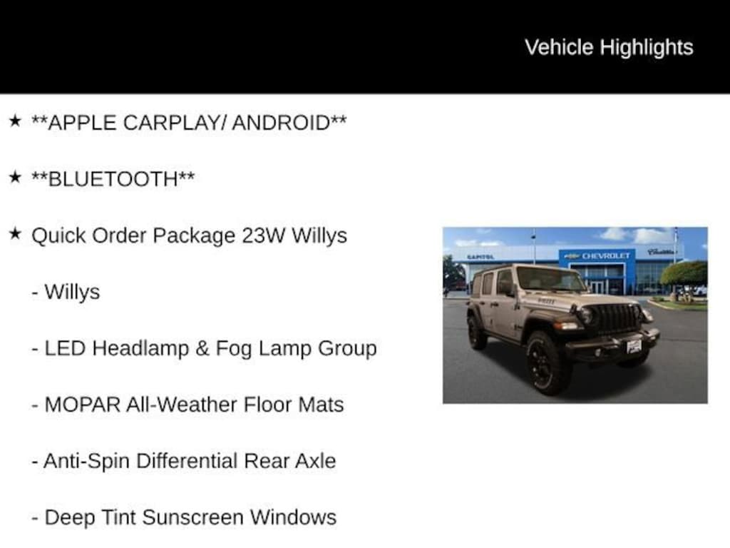 We Buy cars- Fast, Fair and Easy This 2021 Billet Silver Metallic Clearcoat Jeep Wrangler Unlimited Willys 4WD is well equipped and includes these features and benefits: LED Headlamp & Fog Lamp Group (Front LED Fog Lamps and LED Premium Reflector Headlamps), Quick Order Package 23W Willys (4-Wheel Drive Swing Gate Decal, Anti-Spin Differential Rear Axle, Automatic Headlamps, Black Grille, Black Trail Rated Badge, Deep Tint Sunscreen Windows, Front 1-Touch Down Power Windows, Leather Wrapped Steering Wheel, Matte Black Jeep Badge, Mold In Color Bumper w/Gloss Black, MOPAR All-Weather Floor Mats, Power Heated Mirrors, Remote Keyless Entry, Security Alarm, Speed Sensitive Power Locks, Sun Visors w/Illuminated Vanity Mirrors, Wheels: 17 x 7.5 Moab Black Aluminum, Willys, Willys Hood Decal, and Wrangler Decal), Technology Group (7.0 Touchscreen Display, Air Conditioning w/Auto Temperature Control, Air Filtering, Apple CarPlay, Cluster 7.0 TFT Color Display, Google Android Auto, GPS Antenna Input, Integrated Center Stack Radio, Radio: Uconnect 4 w/7 Display, SiriusXM Satellite Radio, USB Host Flip, For More Info, Call 800-643-2112, and SiriusXM Radio Service), Trailer Tow & HD Electrical Group (240 Amp Alternator, 7 & 4 Pin Wiring Harness, 700 Amp Maintenance Free Battery, Auxiliary Switches, and Class II Receiver Hitch), Black 3-Piece Hard Top, Freedom Panel Storage Bag, No Soft Top, Rear Window Defroster, Rear Window Wiper/Washer, 3.45 Rear Axle Ratio, 4-Wheel Disc Brakes, 8 Speakers, ABS brakes, Air Conditioning, AM/FM radio, Aux Battery, Brake assist, Cloth Low-Back Bucket Seats, Compass, Delay-off headlights, Driver door bin, Driver vanity mirror, Dual front impact airbags, Dual front side impact airbags, Electronic Stability Control, Front anti-roll bar, Front Bucket Seats, Front Center Armrest w/Storage, Front fog lights, Front reading lights, Integrated roll-over protection, Low tire pressure warning, MOPAR All-Weather Floor Mats (DISC), MOPAR Hardtop Headliner, Non-Lock Fuel Cap w/o Discriminator, Normal Duty Suspension, Occupant sensing airbag, Outside temperature display, ParkView Rear Back-Up Camera, Passenger door bin, Passenger vanity mirror, Power steering, Radio data system, Radio: Uconnect 3 w/5 Display, Rear anti-roll bar, Rear reading lights, Speed control, Split folding rear seat, Steering wheel mounted audio controls, Stop-Start Dual Battery System, Tachometer, Telescoping steering wheel, Tilt steering wheel, Traction control, Trip computer, Variably intermittent wipers, and Wheels: 17 x 7.5 Black Steel Styled.