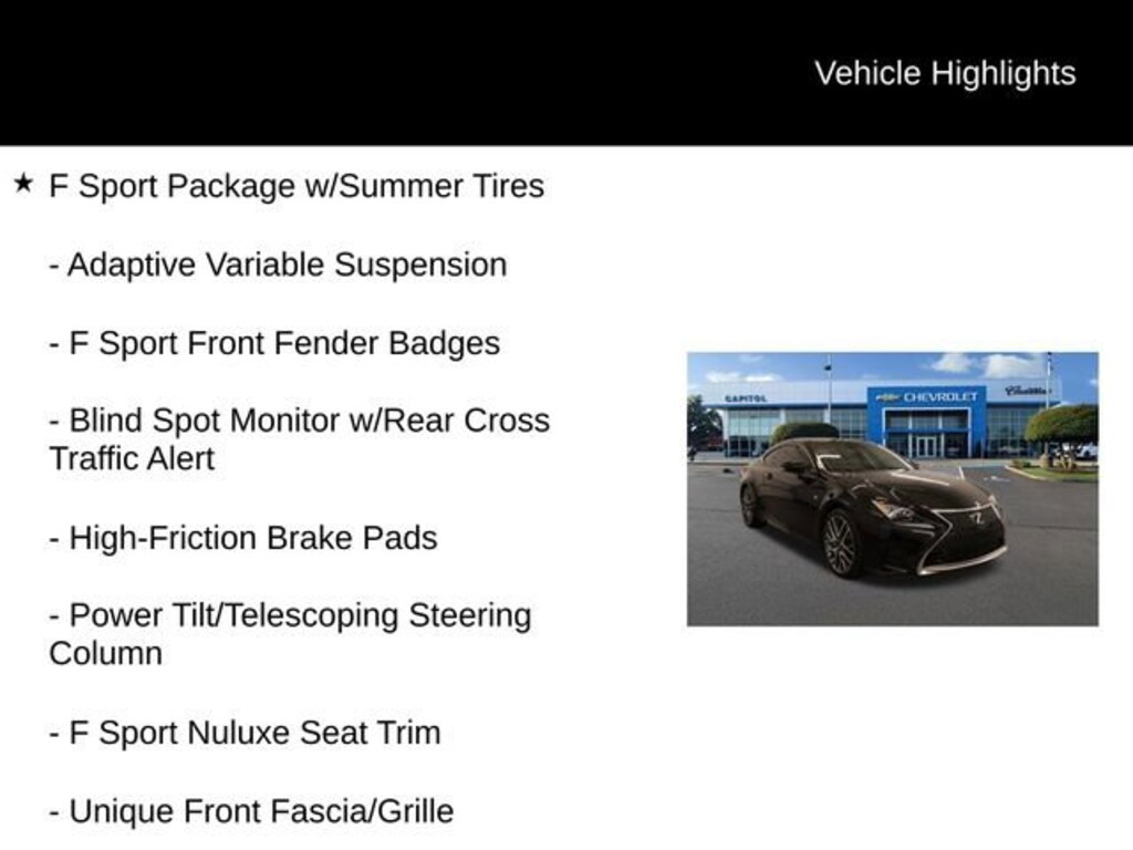 We Buy cars- Fast, Fair and Easy This 2017 Obsidian Lexus RC 200t RWD is well equipped and includes these features and benefits: F Sport Package w/Summer Tires (Adaptive Variable Suspension, Aluminum Sport Pedals, Black Headliner, Blind Spot Monitor w/Rear Cross Traffic Alert, Driver Seat Memory, F Sport Front Fender Badges, F Sport Nuluxe Seat Trim, Glove Box w/Key, Heated & Vented Driver & Passenger Seats, High-Friction Brake Pads, LFA Inspired TFT Instrumentation, Perf Leather Steering Wheel w/Paddle Shifters, Power Front Sport Seats w/Contrast Stitching, Power Tilt/Telescoping Steering Column, Silver Performance Trim, Sport Vehicle Dynamics Integrated Mgmt (VDIM), Stainless Steel Scuff Plates, Unique Front Fascia/Grille, and Wheels: 19 x 9 F SPORT Alloy), 10 Speakers, 4-Wheel Disc Brakes, ABS brakes, Air Conditioning, Alloy wheels, AM/FM radio: SiriusXM, Auto-dimming Rear-View mirror, Automatic temperature control, Back-Up Monitor w/Dynamic Grid Lines, Brake assist, Bumpers: body-color, CD player, Compass, Delay-off headlights, Driver door bin, Driver vanity mirror, Dual front impact airbags, Dual front side impact airbags, Electronic Stability Control, Emergency communication system: Safety Connect, Exterior Parking Camera Rear, Four wheel independent suspension, Front anti-roll bar, Front Bucket Seats, Front Center Armrest, Front dual zone A/C, Front reading lights, Fully automatic headlights, Garage door transmitter: HomeLink, Genuine wood dashboard insert, Genuine wood door panel insert, Heated door mirrors, Illuminated entry, Knee airbag, Leather Shift Knob, Low tire pressure warning, NuLuxe Seat Trim, Occupant sensing airbag, Outside temperature display, Overhead airbag, Overhead console, Panic alarm, Passenger door bin, Passenger vanity mirror, Power door mirrors, Power driver seat, Power Front Bucket Seats, Power passenger seat, Power steering, Power windows, Radio data system, Radio: AM/FM/In-Dash CD Lexus Display Audio, Rear anti-roll bar, Rear reading lights, Rear side impact airbag, Rear window defroster, Remote keyless entry, Security system, Speed control, Speed-sensing steering, Speed-Sensitive Wipers, Split folding rear seat, Steering wheel mounted audio controls, Tachometer, Telescoping steering wheel, Tilt steering wheel, Traction control, Trip computer, Turn signal indicator mirrors, Variably intermittent wipers, and Wheels: 18 x 8 Fr & 18 x 9 5-Spoke Alloy.