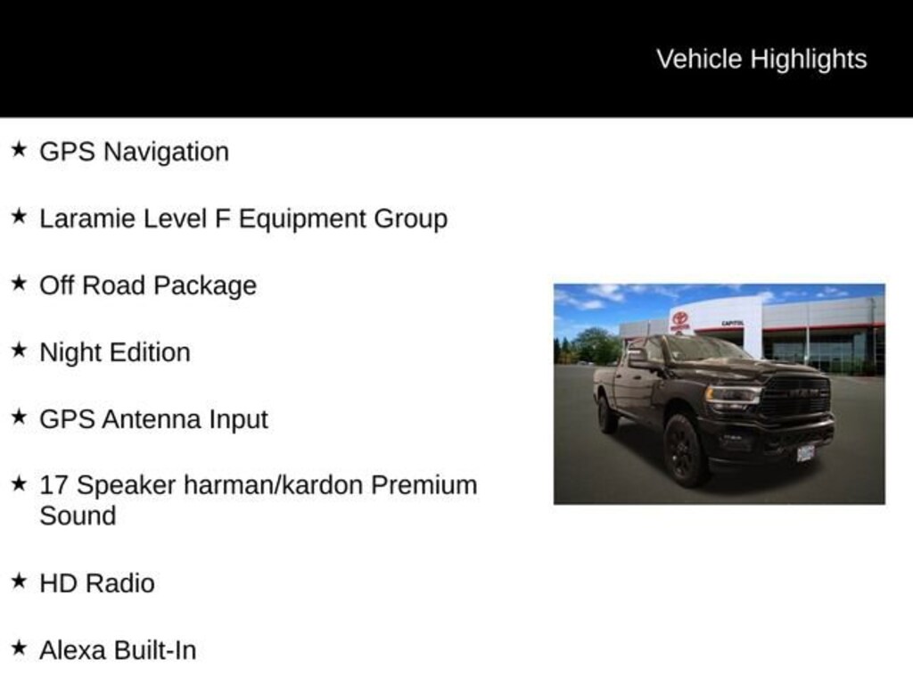 We Buy cars- Fast, Fair and Easy This 2023 Diamond Black Crystal Pearlcoat Ram 2500 Laramie 4WD is well equipped and includes these features and benefits: Laramie Level F Equipment Group (12 Touchscreen Display, 17 Speaker harman/kardon Premium Sound, 2nd Row In Floor Storage Bins, 4G LTE Wi-Fi Hot Spot, Alexa Built-In, Apple CarPlay, Auto Adjust In Reverse Exterior Mirrors, Auto Dim Exterior Mirror, Auto High Beam Headlamp Control, Auto Power-Folding Mirrors, Auto-Dimming Exterior Passenger Mirror, Blind Spot & Cross Path Detection, Chrome Exterior Mirrors, Connected Travel & Traffic Services, Connectivity - US/Canada, Disassociated Touchscreen Display, Exterior Mirrors Courtesy Lamps, Exterior Mirrors w/Heating Element, Exterior Mirrors w/Memory, Exterior Mirrors w/Supplemental Signals, Foam Bottle Insert (Door Trim Panel), For Details, Visit DriveUconnect.com, For More Info, Call 800-643-2112, Forward & Reverse Utility Lights, Front LED Fog Lamps, Global Telematics Box Module (TBM), Google Android Auto, GPS Antenna Input, GPS Navigation, HD Radio, Heated Second Row Seats, Integrated Voice Command w/Bluetooth, LED Reflector Headlamps, Mirror Running Lights, Off-Road Information Pages, ParkSense Front/Rear Park Assist System, Power Adjust Mirrors, Power Adjustable Convex Aux Mirrors, Power Adjustable Pedals w/Memory, Power Heated Fold Telescopic Mirrors w/Memory, Power Telescoping Mirrors, Radio: Uconnect 5 Nav w/12.0 Display, Radio/Driver Seat/Mirrors/Pedals Memory, Rain Sensitive Windshield Wipers, Rear Power Sliding Window, Rear Window Defroster, Remote Tailgate Release, Selectable Tire Fill Alert, SiriusXM Radio Service, SiriusXM w/360L, and Trailer Tow Pages), Night Edition (Black Exterior Truck Badging, Black Headlamp Bezels, Black Interior Accents, Black Ram Head Tailgate Badge, Black Tail Lamp Bezels, Body Color Grille Surround, Gloss Black Grille Billets/Accents, Sport Performance Hood, Wheels: 20 x 8.0 Black Painted Aluminum, and Black Wheel Center Hub), Off Road Package (Front Performance Tuned Shock Absorbers, Hill Descent Control, Rear Performance Tuned Shock Absorbers, and Tow Hooks), Quick Order Package 2HH Laramie, Towing Technology Group (CTR Stop Lamp w/Cargo View Camera, Surround View Camera System, and Trailer Reverse Guidance), 10 Speakers, 115V Auxiliary Rear Power Outlet, 2 Way Rear Headrest Seat, 220 Amp Alternator, 3.73 Axle Ratio, 4 Way Front Headrests, 4-Wheel Disc Brakes, ABS brakes, Active Noise Control System, Adaptive Steering System, Air Conditioning, Alloy wheels, AM/FM radio: SiriusXM with 360L, Anti-Spin Differential Rear Axle, Apple CarPlay/Android Auto, Auto-dimming Rear-View mirror, Automatic temperature control, Brake assist, Bumpers: body-color, Compass, Delay-off headlights, Driver door bin, Driver vanity mirror, Dual Alternators Rated At 440 Amps, Dual front impact airbags, Dual front side impact airbags, Electronic Stability Control, Electronically Controlled Throttle, Front anti-roll bar, Front Center Armrest w/Storage, Front dual zone A/C, Front License Plate Bracket, Front reading lights, Front Seat Back Map Pockets, Fully automatic headlights, Garage door transmitter, Heated door mirrors, Heated Front Seats, Heated front seats, Heated Steering Wheel, Heated steering wheel, Illuminated entry, Leather steering wheel, Leather Trim 40/20/40 Bench Seat, Low tire pressure warning, Manufacturer's Statement of Origin, Navigation System, Occupant sensing airbag, Outside temperature display, Overhead airbag, Overhead console, Panic alarm, ParkView Rear Back-Up Camera, Passenger door bin, Passenger vanity mirror, Power 2-Way Driver Lumbar Adjust, Power 2-Way Passenger Lumbar Adjust, Power Adjust 8-Way Driver Seat, Power Adjust 8-Way Front Passenger Seat, Power door mirrors, Power driver seat, Power passenger seat, Power steering, Power windows, Radio data system, Radio: Uconnect 5 Nav w/8.4 Display, Rear 60/40 Folding Seat, Rear anti-roll bar, Rear reading lights, Rear seat center armr