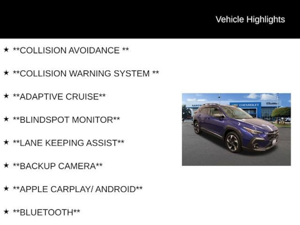 We Buy cars- Fast, Fair and Easy This 2024 Sapphire Blue Pearl Subaru Crosstrek Limited AWD is well equipped and includes these features and benefits: Crosstrek Mirror Package (Auto-Dimming Exterior Mirror w/Approach Light and Auto-Dimming Mirror w/Compass & HomeLink), harman/kardon Audio & Power Moonroof (harman/kardon Surround Sound Speaker System and Power Moonroof), 3.70 Axle Ratio, 4-Wheel Disc Brakes, 6 Speakers, ABS brakes, Air Conditioning, All-Weather Floor Liners (DISC), Alloy wheels, AM/FM radio: SiriusXM, Anti-whiplash front head restraints, Auto High-beam Headlights, Automatic temperature control, Brake assist, Bumpers: body-color, Driver door bin, Driver vanity mirror, Dual front impact airbags, Dual front side impact airbags, Electronic Stability Control, Emergency communication system: STARLINK Safety and Security (Subscription Required), Exterior Parking Camera Rear, Four wheel independent suspension, Front anti-roll bar, Front Bucket Seats, Front Center Armrest, Front dual zone A/C, Front fog lights, Front reading lights, Fully automatic headlights, Heated door mirrors, Heated Front Bucket Seats, Heated front seats, Illuminated entry, Knee airbag, Leather Shift Knob, Leather-Trimmed Upholstery, LED Upgrade, Low tire pressure warning, Occupant sensing airbag, Outside temperature display, Overhead airbag, Overhead console, Panic alarm, Passenger door bin, Passenger vanity mirror, Power door mirrors, Power driver seat, Power steering, Power windows, Radio data system, Radio: Subaru STARLINK 11.6 Multimedia Plus Sys, Rear anti-roll bar, Rear Bumper Cover, Rear seat center armrest, Rear window defroster, Rear window wiper, Remote keyless entry, Security system, Speed control, Speed-sensing steering, Splash Guards, Split folding rear seat, Spoiler, STARLINK/Apple CarPlay/Android Auto, Steering wheel mounted audio controls, Tachometer, Telescoping steering wheel, Tilt steering wheel, Traction control, Trip computer, Turn signal indicator mirrors, Variably intermittent wipers, and Wheels: 18 x 7.0J Dark Gray Aluminum Alloy.