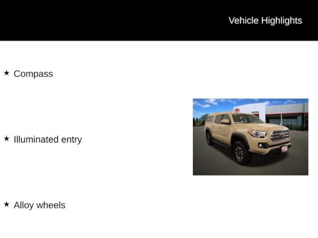 We Buy cars- Fast, Fair and Easy This 2016 Quicksand Toyota Tacoma TRD Offroad RWD is well equipped and includes these features and benefits: TRD Off Road Package (115V/400W Deck Powerpoint and Off Road Tuned Suspension), ABS brakes, Alloy wheels, Compass, Electronic Stability Control, Illuminated entry, Low tire pressure warning, Remote keyless entry, Traction control, 6 Speakers, Air Conditioning, AM/FM radio: SiriusXM, Anti-whiplash front head restraints, Auto-dimming Rear-View mirror, Axle Ratio: 3.91, Brake assist, Bumpers: body-color, CD player, Driver door bin, Dual front impact airbags, Dual front side impact airbags, Exterior Parking Camera Rear, Fabric Seat Trim (FD), Front anti-roll bar, Front Bucket Seats, Front Center Armrest, Front fog lights, Front reading lights, Front wheel independent suspension, Knee airbag, Leather Shift Knob, Occupant sensing airbag, Outside temperature display, Overhead airbag, Overhead console, Panic alarm, Passenger door bin, Power door mirrors, Power steering, Power windows, Radio: Entune Premium w/AM/FM/CD/Nav/App Suite, Rear step bumper, Security system, Speed control, Speed-sensing steering, Split folding rear seat, Steering wheel mounted audio controls, Tachometer, Telescoping steering wheel, Tilt steering wheel, Trip computer, Turn signal indicator mirrors, Variably intermittent wipers, and Wheels: 16 x 7 Machined Contrast Alloy.