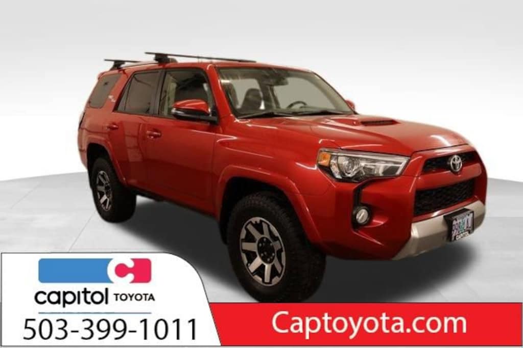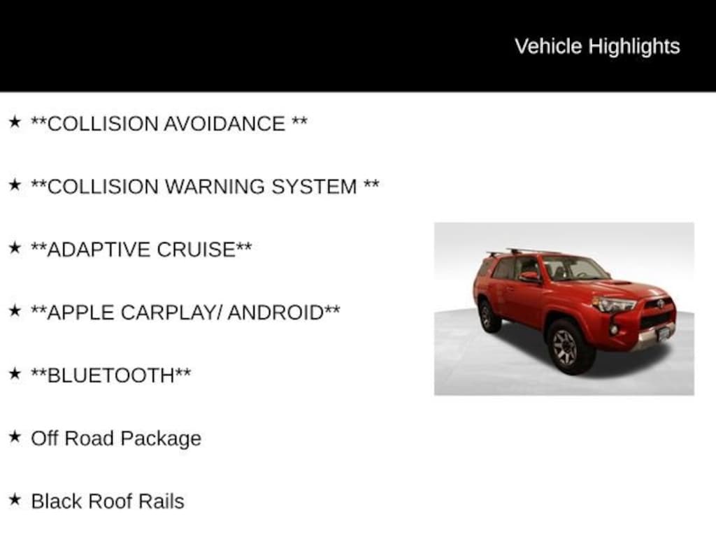 We Buy cars- Fast, Fair and Easy This 2018 Barcelona Red Toyota 4Runner TRD Off-Road Premium 4WD is well equipped and includes these features and benefits: Off Road Package (Black Roof Rails), 3.727 Axle Ratio, 4-Wheel Disc Brakes, 8 Speakers, ABS brakes, Air Conditioning, Alloy wheels, AM/FM radio: SiriusXM, Anti-whiplash front head restraints, Auto-Dimming Rear-View Mirror, Auto-dimming Rear-View mirror, Body Color Heated Mirrors, Brake assist, Bumpers: body-color, CD player, Compass, Driver door bin, Driver vanity mirror, Dual front impact airbags, Dual front side impact airbags, Electronic Stability Control, Emergency communication system: Safety Connect, Exterior Parking Camera Rear, Front anti-roll bar, Front Bucket Seats, Front Center Armrest, Front fog lights, Front reading lights, Front wheel independent suspension, Garage Door Opener, Garage door transmitter: HomeLink, Heated door mirrors, Heated Front Bucket Seats, Heated front seats, Illuminated entry, Knee airbag, Leather Shift Knob, Low tire pressure warning, Moonroof w/Tilt Up & Slide, Navigation System, Occupant sensing airbag, Outside temperature display, Overhead airbag, Overhead console, Panic alarm, Passenger door bin, Passenger vanity mirror, Power door mirrors, Power driver seat, Power passenger seat, Power steering, Power windows, Radio: Entune Premium Audio w/Navigation, Rear anti-roll bar, Rear seat center armrest, Rear window defroster, Rear window wiper, Remote keyless entry, Roof rack: rails only, Security system, Softex Synthetic Leather Seat Trim, Speed control, Speed-sensing steering, Split folding rear seat, Spoiler, Steering wheel mounted audio controls, Tachometer, Telescoping steering wheel, Tilt steering wheel, Traction control, Trip computer, Turn signal indicator mirrors, Variably intermittent wipers, and Wheels: 17 x 7.5 7-Spoke Unique Off-Road Alloy.