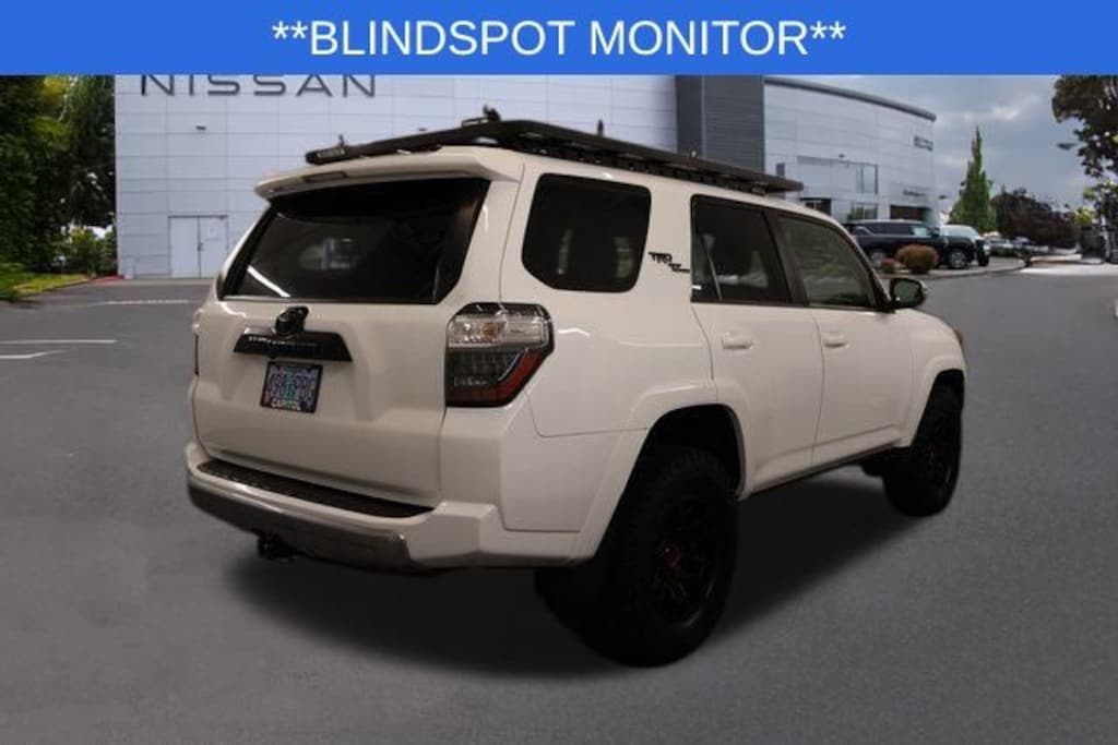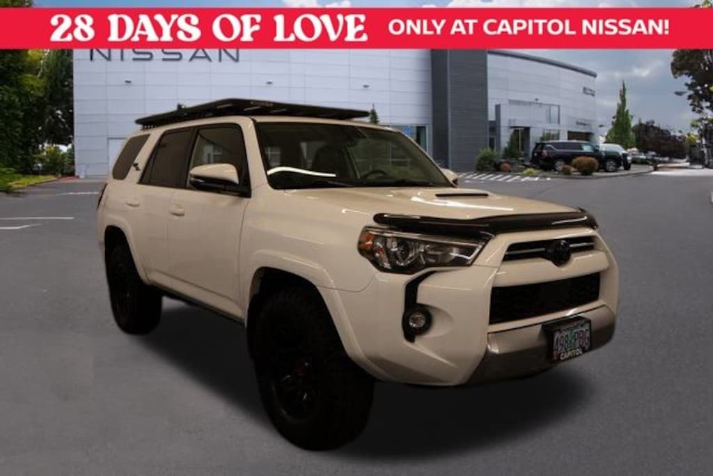 We Buy cars- Fast, Fair and Easy This 2022 White Toyota 4Runner TRD Off-Road Premium 4WD is well equipped and includes these features and benefits: 4WD, Black/Graphite Artificial Leather, Apple CarPlay/Android Auto, Auto High-beam Headlights, Exterior Parking Camera Rear, 3.727 Axle Ratio, 4-Wheel Disc Brakes, 8 Speakers, ABS brakes, Air Conditioning, Alloy wheels, AM/FM radio: SiriusXM, Anti-whiplash front head restraints, Auto-dimming Rear-View mirror, Black Roof Rails, Blind Spot Monitor (BSM), Brake assist, Bumpers: body-color, Compass, Driver door bin, Driver vanity mirror, Dual front impact airbags, Dual front side impact airbags, Electronic Stability Control, Emergency communication system: Safety Connect with 1-year trial, Front anti-roll bar, Front Bucket Seats, Front Center Armrest, Front fog lights, Front reading lights, Front wheel independent suspension, Garage Door Opener, Garage door transmitter: HomeLink, Heated door mirrors, Heated Front Bucket Seats, Heated front seats, Illuminated entry, Knee airbag, Leather Shift Knob, Low tire pressure warning, Occupant sensing airbag, Outside Rear View Mirror, Outside temperature display, Overhead airbag, Overhead console, Panic alarm, Passenger door bin, Passenger vanity mirror, Power door mirrors, Power driver seat, Power passenger seat, Power steering, Power windows, Radio: Premium Audio w/Dynamic Navigation, Rear anti-roll bar, Rear seat center armrest, Rear window defroster, Rear window wiper, Remote keyless entry, Roof rack: rails only, Security system, SofTex Seat Trim, Speed control, Speed-sensing steering, Split folding rear seat, Spoiler, Steering wheel mounted audio controls, Tachometer, Telescoping steering wheel, Tilt steering wheel, Traction control, Trip computer, Turn signal indicator mirrors, Variably intermittent wipers, and Wheels: 17" Unique 7-Spoke Off-Road Alloy. **BLINDSPOT MONITOR**, **LANE KEEPING ASSIST**, **BACKUP CAMERA**, **APPLE CARPLAY/ ANDROID**, **BLUETOOTH**, 4WD, Black/Graphite Artificial Leather, Apple CarPlay/Android Auto, Auto High-beam Headlights, Exterior Parking Camera Rear.