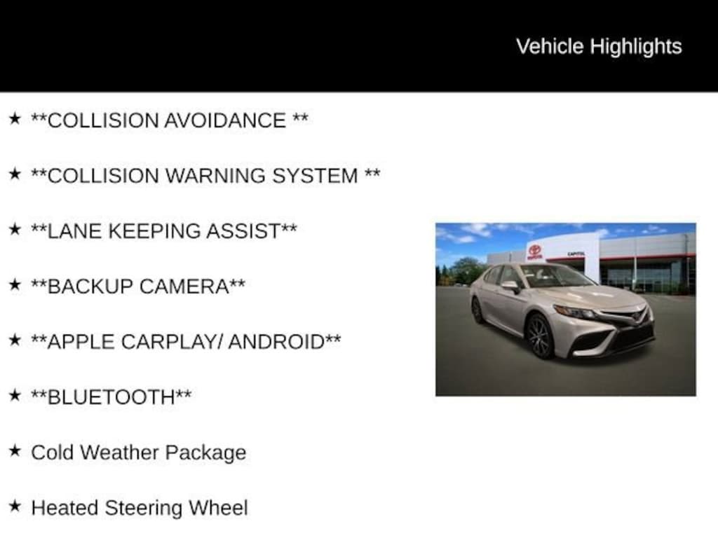 We Buy cars- Fast, Fair and Easy This 2022 Celestial Silver Toyota Camry SE AWD is well equipped and includes these features and benefits: Cold Weather Package (Heated Front Bucket Seats and Heated Steering Wheel), 4-Wheel Disc Brakes, 6 Speakers, ABS brakes, Air Conditioning, Alloy wheels, AM/FM radio: SiriusXM, Apple CarPlay/Android Auto, Auto High-beam Headlights, Automatic temperature control, Brake assist, Bumpers: body-color, Delay-off headlights, Driver door bin, Driver vanity mirror, Dual front impact airbags, Dual front side impact airbags, Electronic Stability Control, Emergency communication system: Safety Connect with 1-year trial, Exterior Parking Camera Rear, Fabric Seat Trim w/Sport SofTex, Four wheel independent suspension, Front anti-roll bar, Front Bucket Seats, Front Center Armrest, Front dual zone A/C, Front reading lights, Fully automatic headlights, Heated door mirrors, Illuminated entry, Knee airbag, Low tire pressure warning, Occupant sensing airbag, Outside temperature display, Overhead airbag, Overhead console, Panic alarm, Passenger door bin, Passenger vanity mirror, Power door mirrors, Power driver seat, Power steering, Power windows, Radio data system, Radio: AM/FM Audio System, Rear anti-roll bar, Rear seat center armrest, Rear side impact airbag, Rear window defroster, Remote keyless entry, Security system, Speed control, Speed-sensing steering, Split folding rear seat, Spoiler, Steering wheel mounted audio controls, Tachometer, Telescoping steering wheel, Tilt steering wheel, Traction control, Trip computer, Turn signal indicator mirrors, Variably intermittent wipers, and Wheels: 8.0J x 18 Black Machined-Finish Alloy.