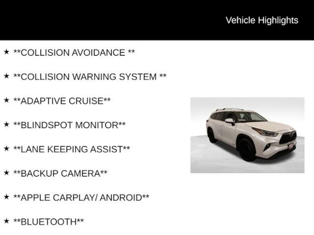 We Buy cars- Fast, Fair and Easy This 2023 Wind Chill Pearl Toyota Highlander Hybrid Limited AWD is well equipped and includes these features and benefits: 11 Speakers, 20 Alloy Wheels, 3rd row seats: split-bench, 4-Wheel Disc Brakes, ABS brakes, Air Conditioning, Alloy wheels, AM/FM radio: SiriusXM, Apple CarPlay/Android Auto, Auto High-beam Headlights, Auto-dimming Rear-View mirror, Automatic temperature control, Axle Ratio: TBD, Brake assist, Bumpers: body-color, Chrome wheels, Delay-off headlights, Driver door bin, Driver vanity mirror, Dual front impact airbags, Dual front side impact airbags, Electronic Stability Control, Emergency communication system: Safety Connect (up to 10-year trial subscription), Exterior Parking Camera Rear, Four wheel independent suspension, Front anti-roll bar, Front Bucket Seats, Front Center Armrest, Front dual zone A/C, Front fog lights, Front reading lights, Fully automatic headlights, Garage door transmitter: HomeLink, Heated door mirrors, Heated Front Bucket Seats, Heated front seats, Heated steering wheel, Illuminated entry, Knee airbag, Leather Seat Trim, Leather Shift Knob, Leather steering wheel, Low tire pressure warning, Memory seat, Navigation system: Drive Connect Cloud Navigation (1-year trial subscription), Occupant sensing airbag, Outside temperature display, Overhead airbag, Overhead console, Panic alarm, Passenger door bin, Passenger vanity mirror, Power door mirrors, Power driver seat, Power Liftgate, Power moonroof, Power passenger seat, Power steering, Power windows, Radio: 12.3 Toyota Audio Multimedia w/JBL Premium, Rear air conditioning, Rear anti-roll bar, Rear reading lights, Rear window defroster, Rear window wiper, Reclining 3rd row seat, Remote keyless entry, Roof rack: rails only, Security system, Speed control, Speed-sensing steering, Split folding rear seat, Spoiler, Steering wheel mounted audio controls, Telescoping steering wheel, Tilt steering wheel, Traction control, Trip computer, Turn signal indicator mirrors, Variably intermittent wipers, and Ventilated front seats.