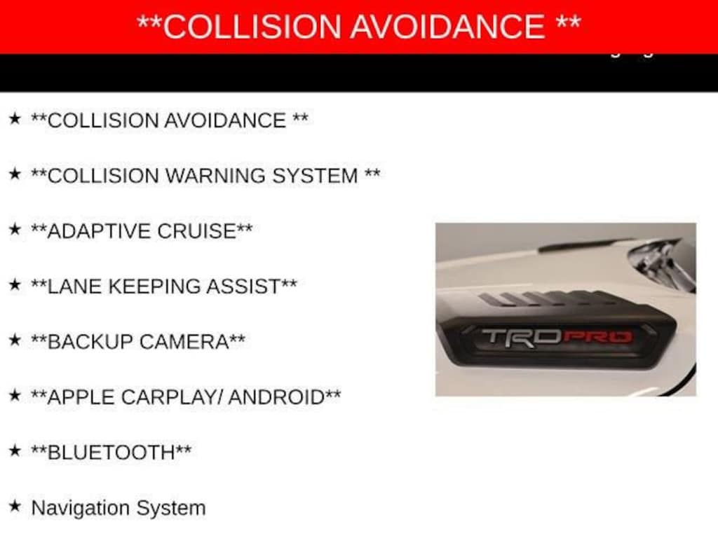 **COLLISION AVOIDANCE **, **COLLISION WARNING SYSTEM **, **ADAPTIVE CRUISE**, **BACKUP CAMERA**, **APPLE CARPLAY/ ANDROID**, **BLUETOOTH**, Cast Aluminum Step & Step Cover, JBL 14 Speakers, Multi-Terrain Back Monitor, Pro High Grade Full LED Headlamps, Tow Technology Package, TRD Pro Leather-Trimmed Steering Wheel, TRD Pro LED Light Bar, TRD Pro Package, TRD Pro Under Cover & Protector, Wireless Smartphone Charger.