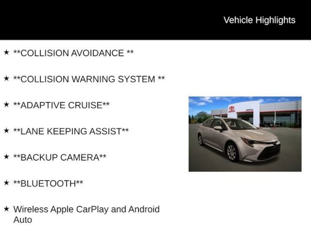 We Buy cars- Fast, Fair and Easy This 2024 Classic Silver Metallic Toyota Corolla LE FWD is well equipped and includes these features and benefits: 16 Steel Wheels w/Covers, 4-Wheel Disc Brakes, 6 Speakers, ABS brakes, Air Conditioning, AM/FM radio: SiriusXM, Auto High-beam Headlights, Automatic temperature control, Brake assist, Bumpers: body-color, Delay-off headlights, Driver door bin, Driver vanity mirror, Dual front impact airbags, Dual front side impact airbags, Electronic Stability Control, Emergency communication system: Safety Connect (up to 10-year trial subscription), Exterior Parking Camera Rear, Fabric Seat Trim, Front anti-roll bar, Front Bucket Seats, Front Center Armrest, Front reading lights, Front wheel independent suspension, Fully automatic headlights, Illuminated entry, Knee airbag, Low tire pressure warning, Occupant sensing airbag, Outside temperature display, Overhead airbag, Panic alarm, Passenger door bin, Passenger vanity mirror, Power door mirrors, Power steering, Power windows, Radio data system, Radio: 8 Toyota Audio Multimedia, Rear anti-roll bar, Rear seat center armrest, Rear side impact airbag, Rear window defroster, Remote keyless entry, Speed control, Split folding rear seat, Steering wheel mounted audio controls, Tachometer, Telescoping steering wheel, Tilt steering wheel, Traction control, and Trip computer.