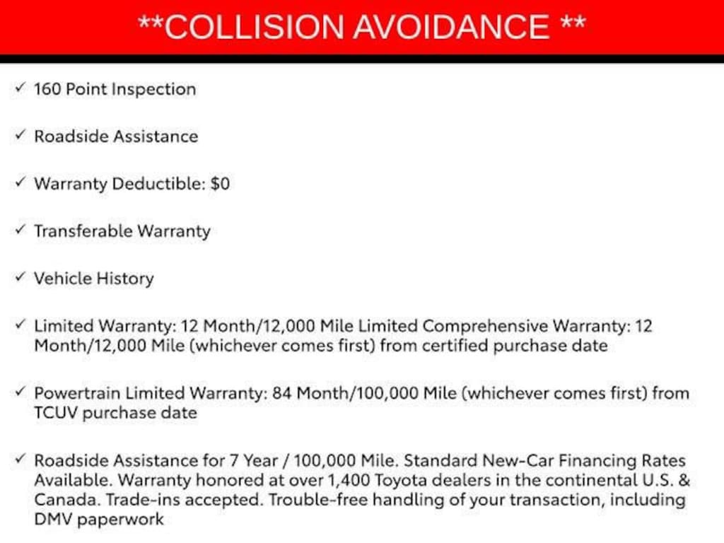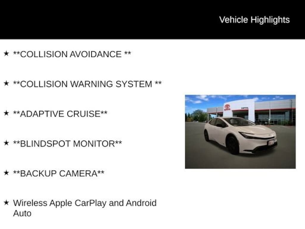 **COLLISION AVOIDANCE **, **COLLISION WARNING SYSTEM **, **ADAPTIVE CRUISE**, **BLINDSPOT MONITOR**, **BACKUP CAMERA**, Wireless Apple CarPlay and Android Auto.