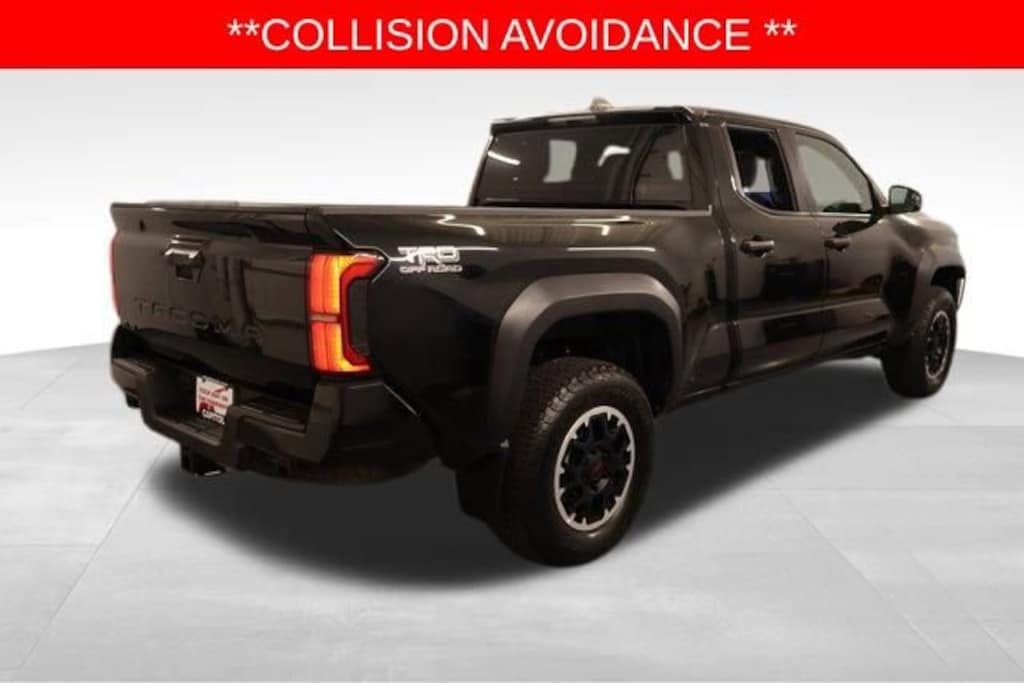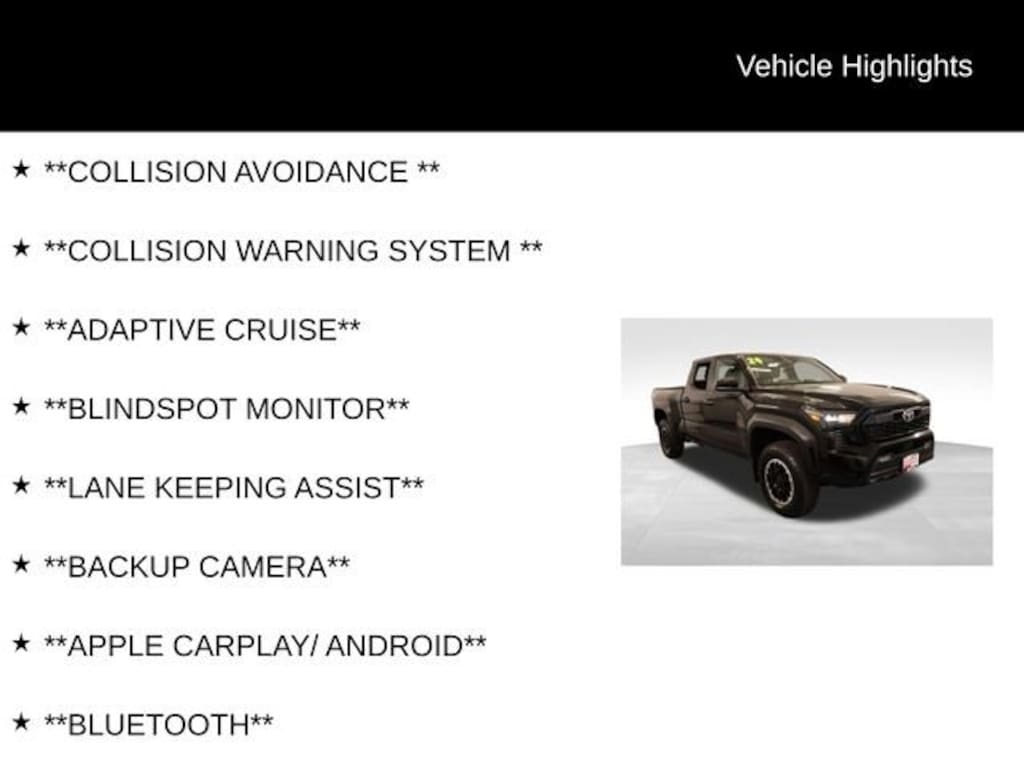 We Buy cars- Fast, Fair and Easy This 2024 Black Toyota Tacoma TRD Offroad 4WD is well equipped and includes these features and benefits: 3.583 Axle Ratio, 4-Wheel Disc Brakes, 6 Speakers, ABS brakes, Air Conditioning, Alloy wheels, AM/FM radio: SiriusXM, Anti-whiplash front head restraints, Apple CarPlay/Android Auto, Auto High-beam Headlights, Auto-dimming Rear-View mirror, Automatic temperature control, Brake assist, Bumpers: body-color, Driver door bin, Driver vanity mirror, Dual front impact airbags, Dual front side impact airbags, Electronic Stability Control, Emergency communication system: Safety Connect (1-year trial), Exterior Parking Camera Rear, Fabric Seat Trim (FD), Four wheel independent suspension, Front anti-roll bar, Front Bucket Seats, Front Center Armrest, Front fog lights, Front reading lights, Fully automatic headlights, Heated door mirrors, Illuminated entry, Knee airbag, Leather Shift Knob, Leather steering wheel, Low tire pressure warning, Occupant sensing airbag, Outside temperature display, Overhead airbag, Overhead console, Panic alarm, Passenger door bin, Passenger vanity mirror, Power door mirrors, Power steering, Power windows, Radio: 8 Toyota Audio Multimedia, Rear step bumper, Rear window defroster, Remote keyless entry, Security system, Speed control, Speed-sensing steering, Split folding rear seat, Steering wheel mounted audio controls, Tachometer, Telescoping steering wheel, Tilt steering wheel, Traction control, Trip computer, Turn signal indicator mirrors, Variably intermittent wipers, and Wheels: 17 TRD Off-Road Alloy.