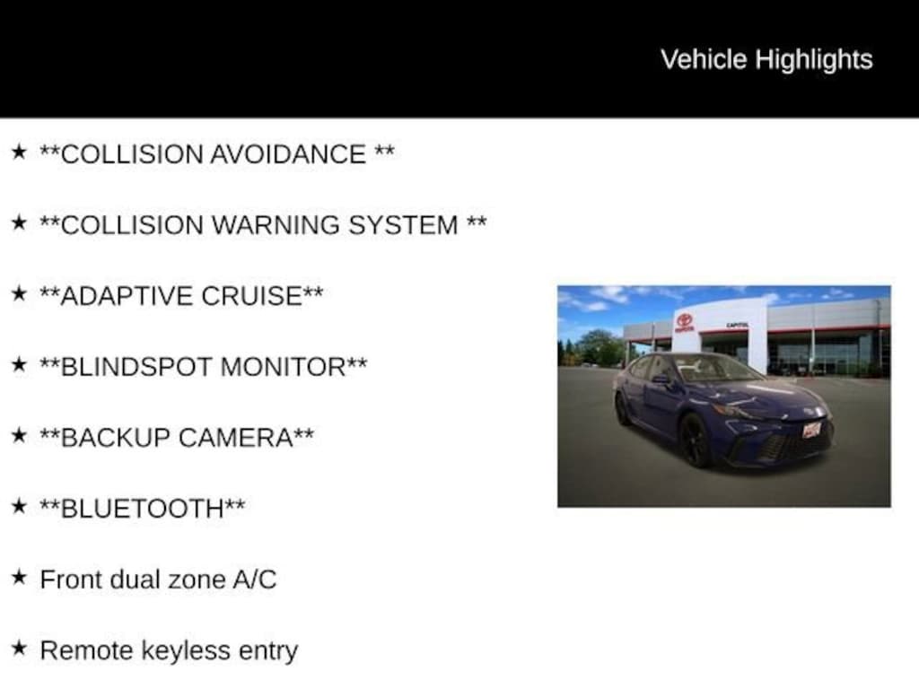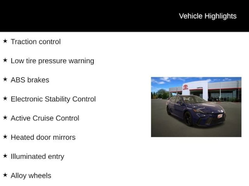 We Buy cars- Fast, Fair and Easy This 2025 Reservoir Blue Toyota Camry SE FWD is well equipped and includes these features and benefits: ABS brakes, Active Cruise Control, Alloy wheels, Electronic Stability Control, Front dual zone A/C, Heated door mirrors, Illuminated entry, Low tire pressure warning, Remote keyless entry, Traction control, 4-Wheel Disc Brakes, 6 Speakers, Air Conditioning, AM/FM radio: SiriusXM, Apple CarPlay/Android Auto, Auto High-beam Headlights, Automatic temperature control, Brake assist, Bumpers: body-color, Delay-off headlights, Driver door bin, Driver vanity mirror, Dual front impact airbags, Dual front side impact airbags, Emergency communication system: Safety Connect (up to 10-year trial subscription), Exterior Parking Camera Rear, Four wheel independent suspension, Front anti-roll bar, Front Bucket Seats, Front Center Armrest, Front reading lights, Fully automatic headlights, Knee airbag, Leather Shift Knob, Leather steering wheel, Occupant sensing airbag, Outside temperature display, Overhead airbag, Overhead console, Panic alarm, Passenger door bin, Passenger vanity mirror, Power door mirrors, Power driver seat, Power steering, Power windows, Radio data system, Radio: Toyota Audio Multimedia w/8 Touchscreen, Rear anti-roll bar, Rear reading lights, Rear seat center armrest, Rear side impact airbag, Rear window defroster, Security system, SofTex & Fabric Seat Trim, Speed control, Speed-sensing steering, Split folding rear seat, Spoiler, Steering wheel mounted audio controls, Telescoping steering wheel, Tilt steering wheel, Trip computer, Turn signal indicator mirrors, Variably intermittent wipers, and Wheels: 18 Black-Finished Alloy.